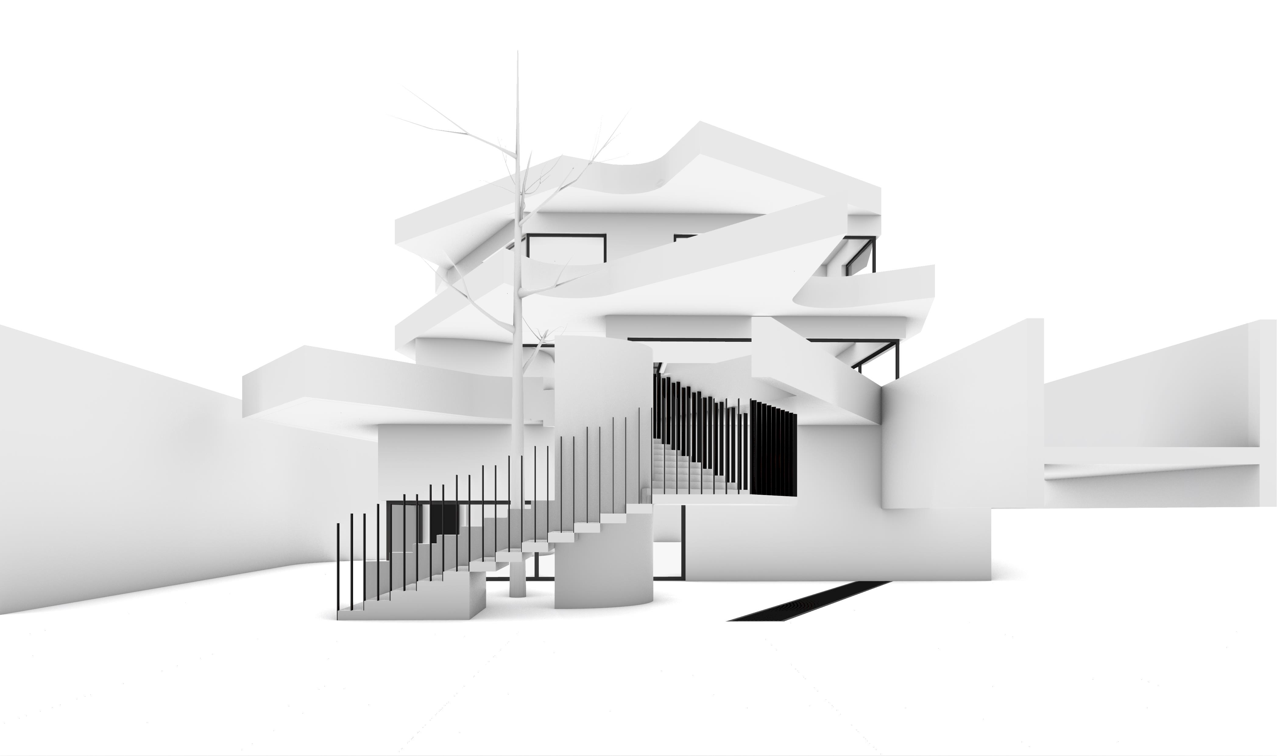 add light raw concrete texture on building add small cobblestone texture on the ground replace the tree in the middle with a smaller realistic tree but keep it behind the wall add sky in the background