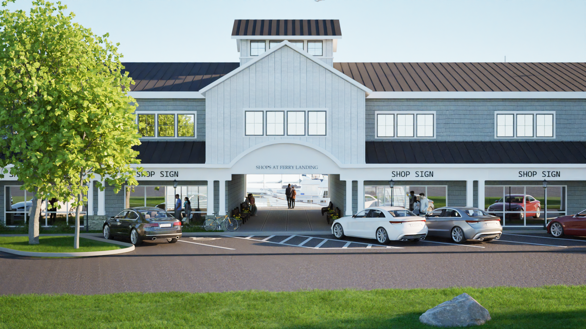 this is a new clubhouse being built for a local marina the siding is gray shingle except for the center which is white vertical clapboard the roofing is a dark metal standing seam the lighting should reflect a sunset with a few puffy clouds in the sky through the tunnel under the gable you can see the boats of the marina