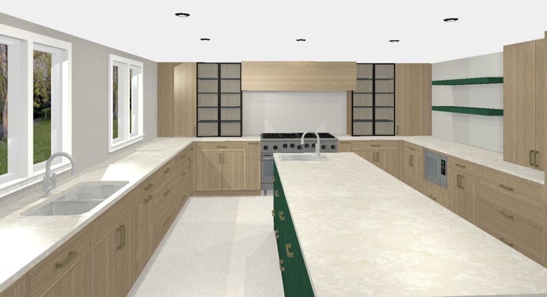 perspective shot change green color of island and open shelving to white oak to match other cabinets kitchen countertops and back splash to be taj mahal quartzite black windows kitchen stove hood to be lime wash paint