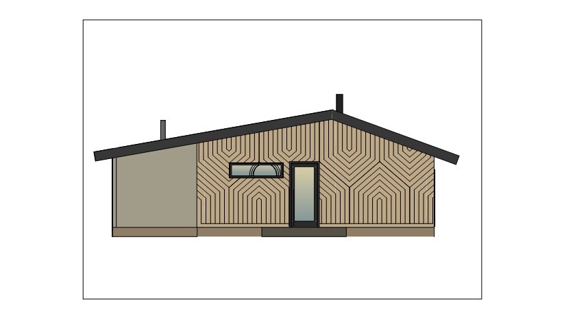 modernist exterior shot create a beautifully rendered image of a modern house with a sloped roof use warm beige and light brown tones for the wooden exterior cladding enhancing the natural texture incorporate elegant geometric patterns subtly in the wooden siding the roof should be a sleek deep charcoal gray adding a contemporary look the window and door frames should be black creating a striking contrast use soft white for the window glass to reflect ambient light the overall atmosphere should be calm and harmonious with a sense of modern minimalist elegance include a clear sky with soft pastel hues in the background for a serene setting architecture
