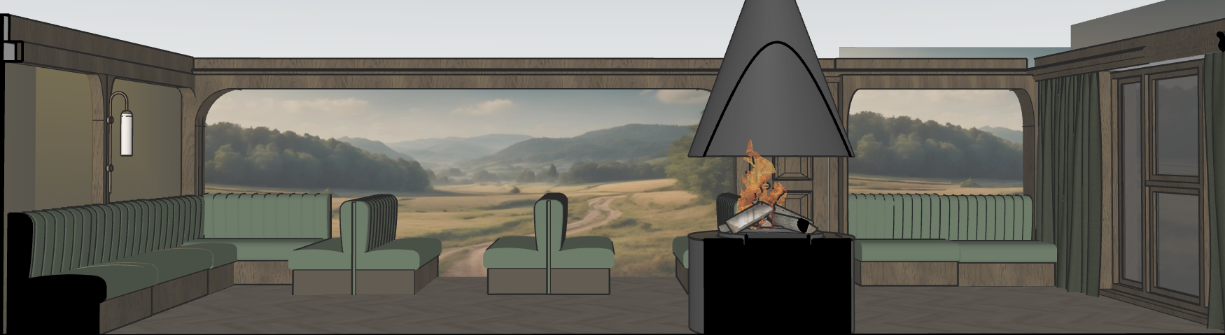 render this space to use booth seating fabric and material texture with fringe detail and bolster as the reference the mural is to be softly lit up and large window to the right using exact layout and dimensions