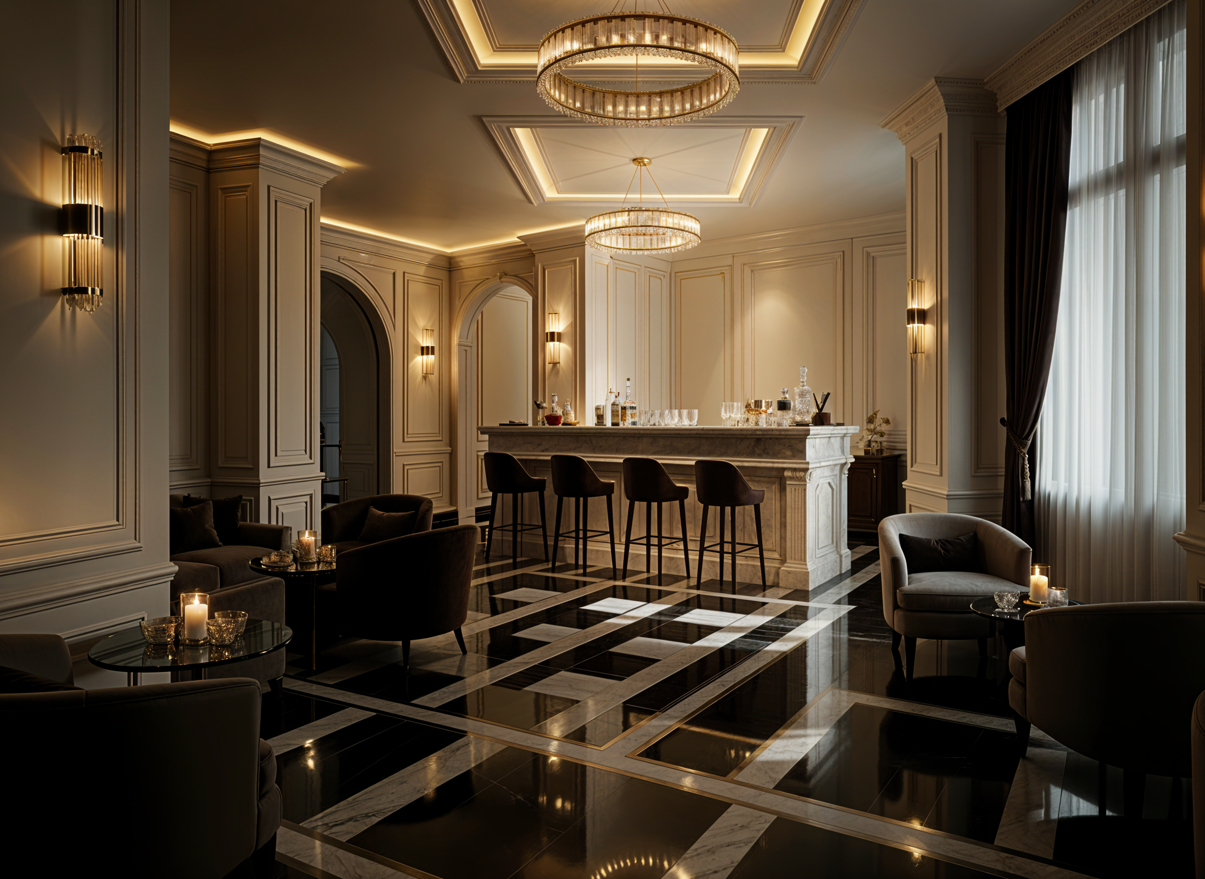 transform this visualization into a cinematic sunset golden hour atmosphere with maximum elegance and drama keep all materials finishes and geometry exactly as designed intensify low angle warm light to create long soft shadows glowing reflections on walnut champagne velvet and patinated brass introduce selective decorative and architectural lighting to enhance drama subtle uplights hidden sconces and accent lamps emphasize layered illumination atmospheric glow reflections and contrast to make the scene rich sophisticated and immersive maintain all materials colors and furniture as is