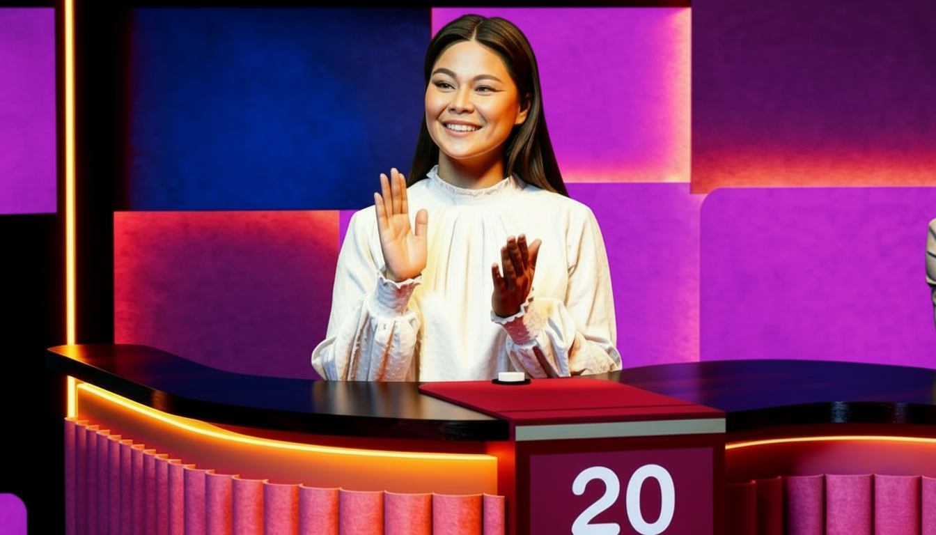 create an elegant game show scene featuring a smiling contestant clapping at a sleek podium she wears a white blouse with delicate ruffles the background features vibrant purple and blue panels giving a modern and vibrant feel the podium displays the number 20 prominently in bold white on a deep red background complemented by glowing orange lights accentuating the edges use a warm inviting color palette to create an atmosphere of excitement and positive energy