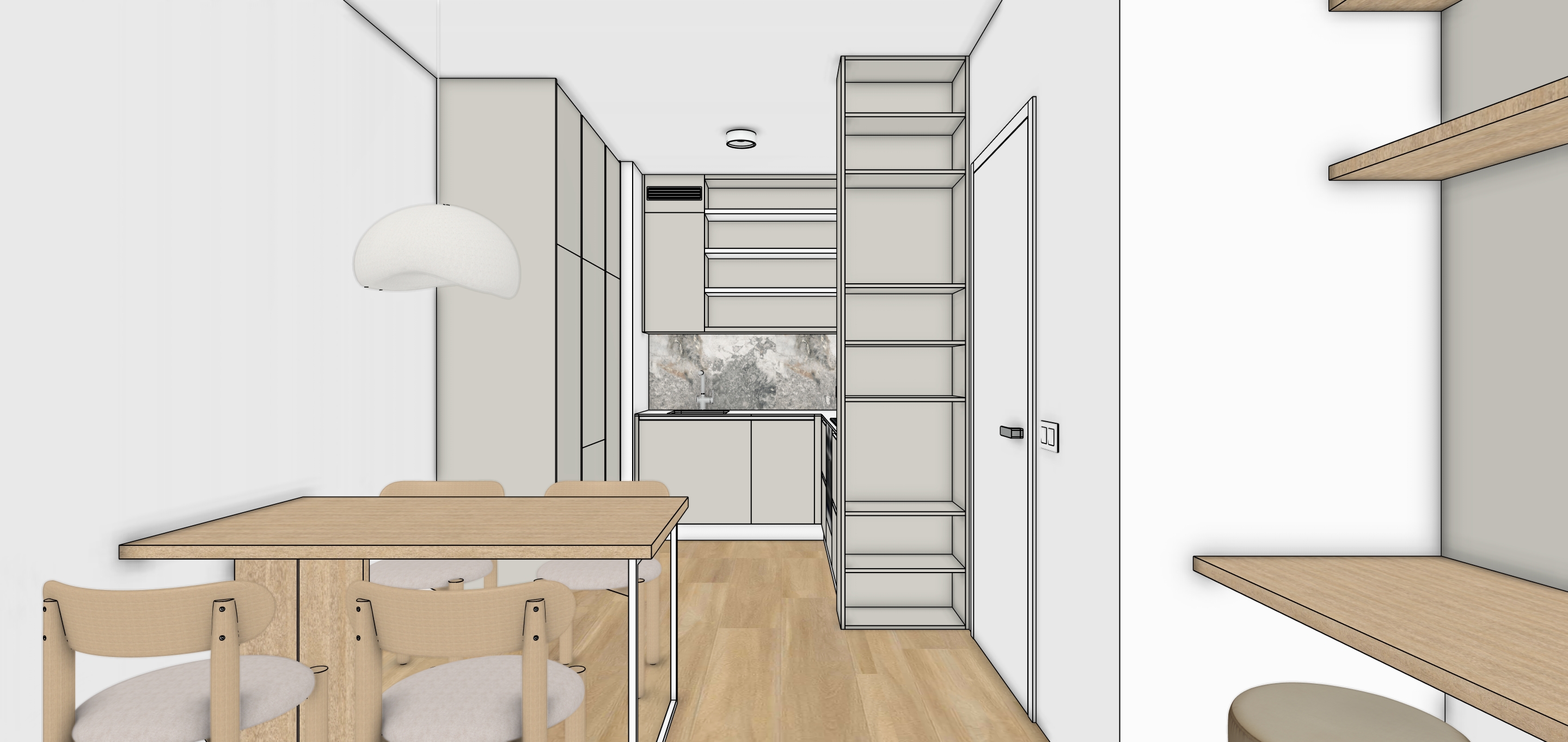 modern kitchen neutral palette with light oak wooden floor greybeige on kitchen cabinets white walls pendant light with textured resin surface in white