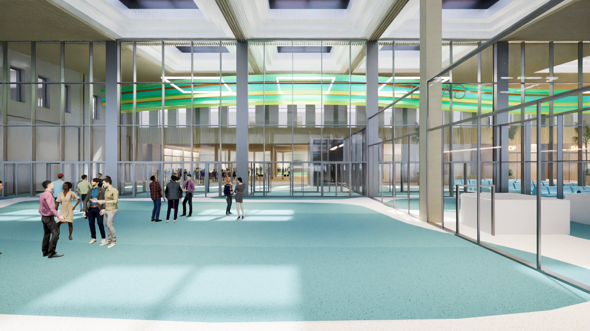 render a spacious modern interior atrium with tall glass walls and ceiling allowing natural light to flood the area incorporate soft turquoise flooring and creamy white walkways alongside sleek silver and gray pillars above add vibrant green and blue gradient panels suspended in rows populate the scene with diverse groups of people engaging and walking wearing business casual attire in muted earthy tones create a bright welcoming atmosphere with a contemporary and open air feel