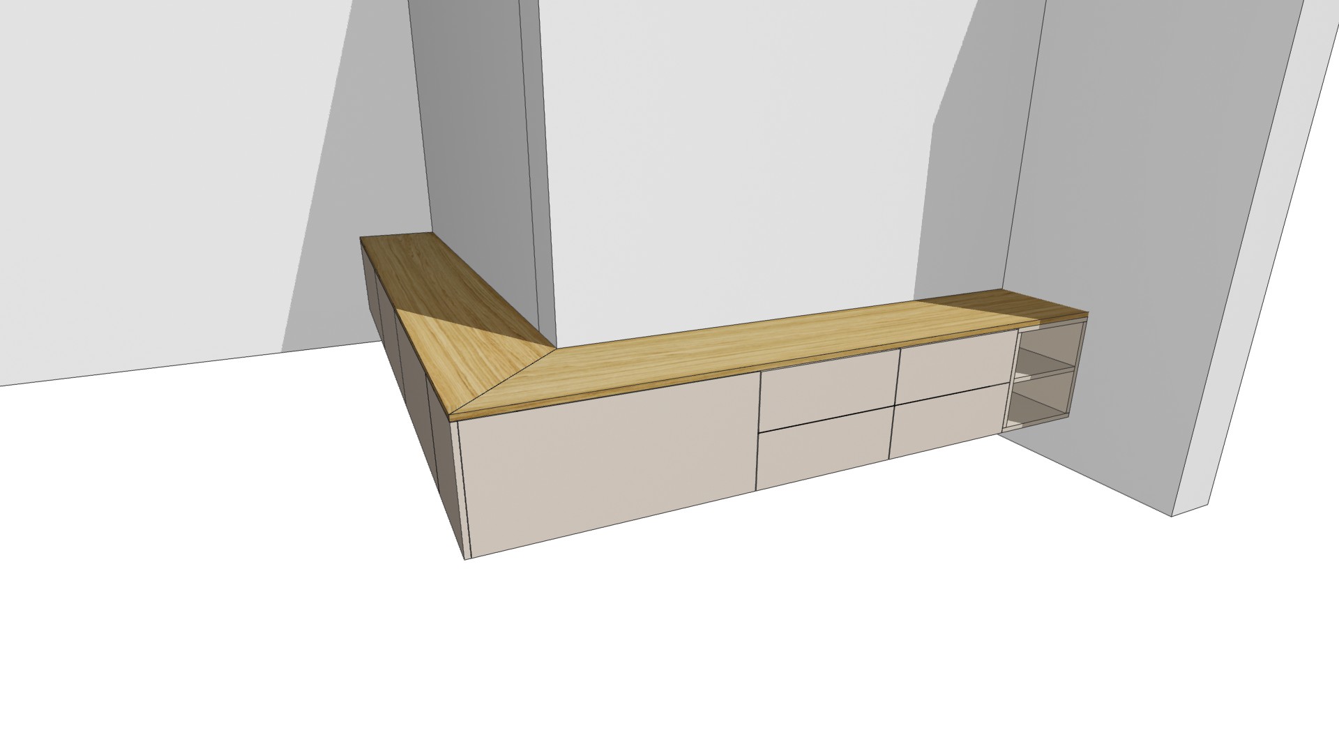 photorealistic architectural visualization of a custom l shaped floating tv cabinet installed around a wall corner furniture design a long l shaped wall mounted cabinet wrapping around a corner wall the cabinet is floating above the floor materials cabinet fronts and visible sides egger u702 pm perfectsense matte greige anti fingerprint cabinet interior white alpine board top surface shinnoki natural oak 4 0 veneer warm natural oak tone with visible grain top panel corner joined with a 45 degree miter joint lighting warm white led strip under the entire cabinet led light creates a soft glow on the floor indirect lighting light temperature approx 3000k environment modern minimalist interior neutral light wall color natural oak wooden floor realistic shadows and reflections soft interior lighting camera perspective similar to the reference image slightly angled view about 25 degrees eye level style photorealistic architectural visualization ultra realistic materials soft lighting interior design render high end modern furniture