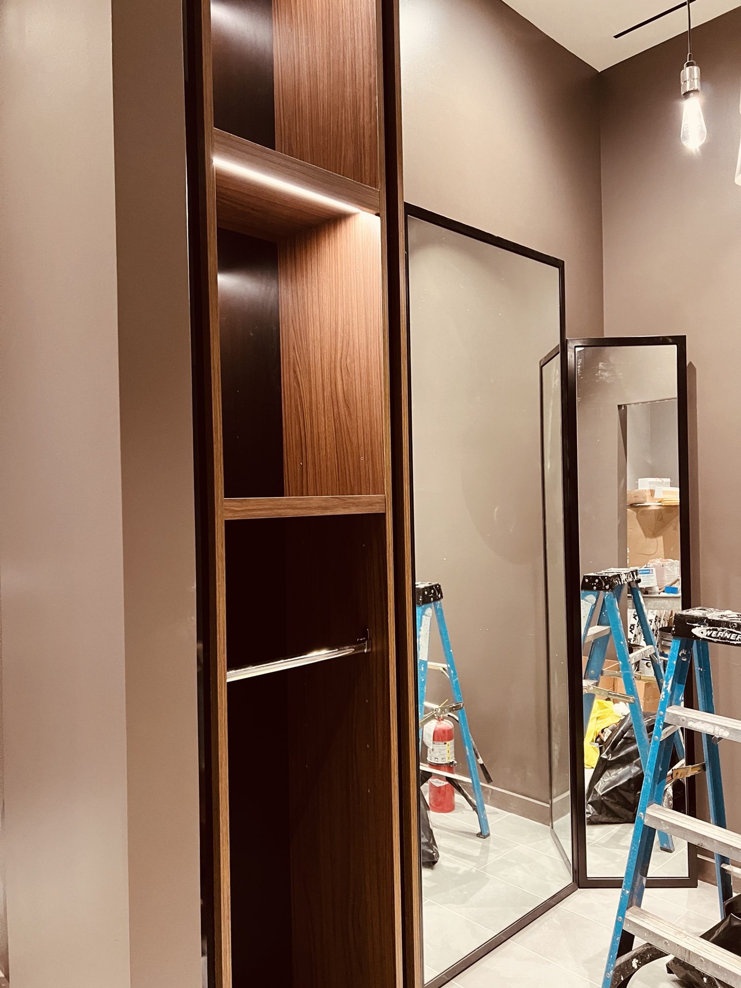 create a wall mounted display for a retails store this product display should be of walnut finishes with glass movable shelves this product display should be modern and modular architecture