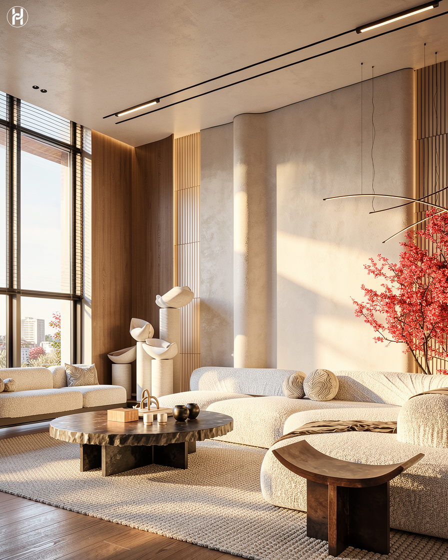 pavimento in parquet rovere chiaro con posa a spina arredi in rovere chiaro tessuti chiari con sommier e testata letto con motivo imbottito verticale in ecopelle chiara lampada da terra a frange colore ruggine con luce accesa applique in ottone accese