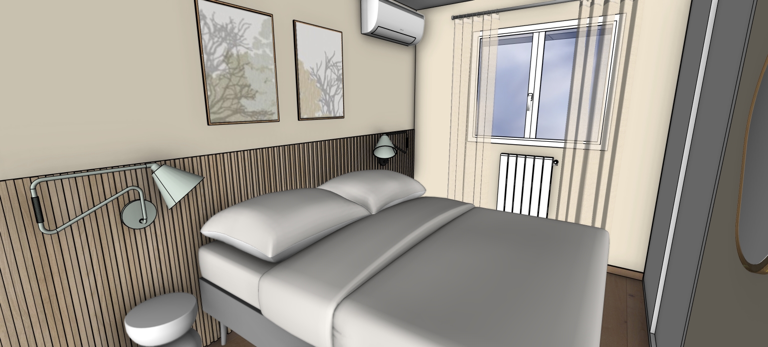 respecter integralement la geometrie et les couleurs du modele une lumiere douce naturelle rentre par la fenetre les lampes de chevet sont allumees les murs sont couleur vanille les appliques murales sont en metal vert menthe