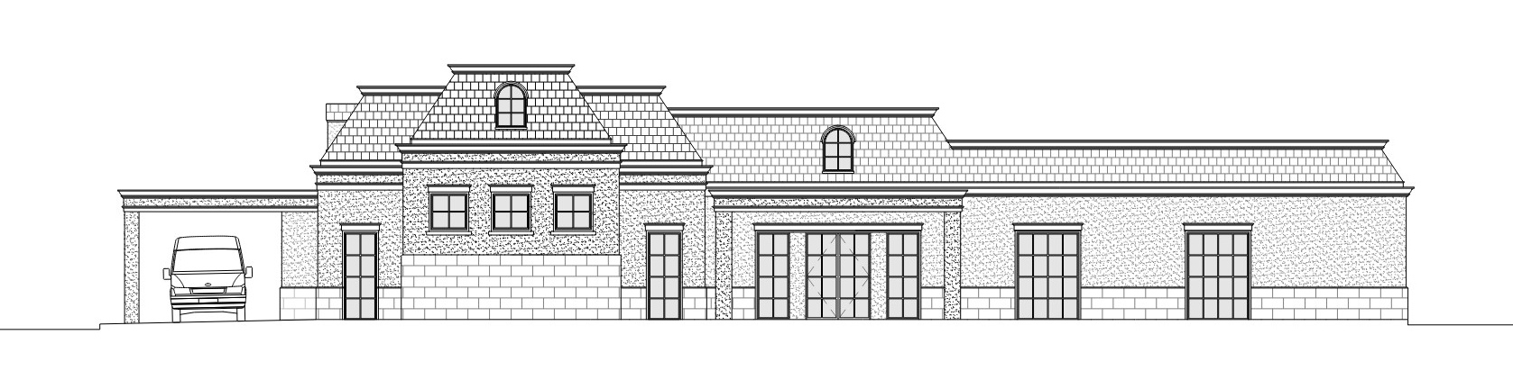 make into a modern style building limestone walls and a slate roof make the water table out of a slightly darker color put parking in front with the element in the middle being a carport