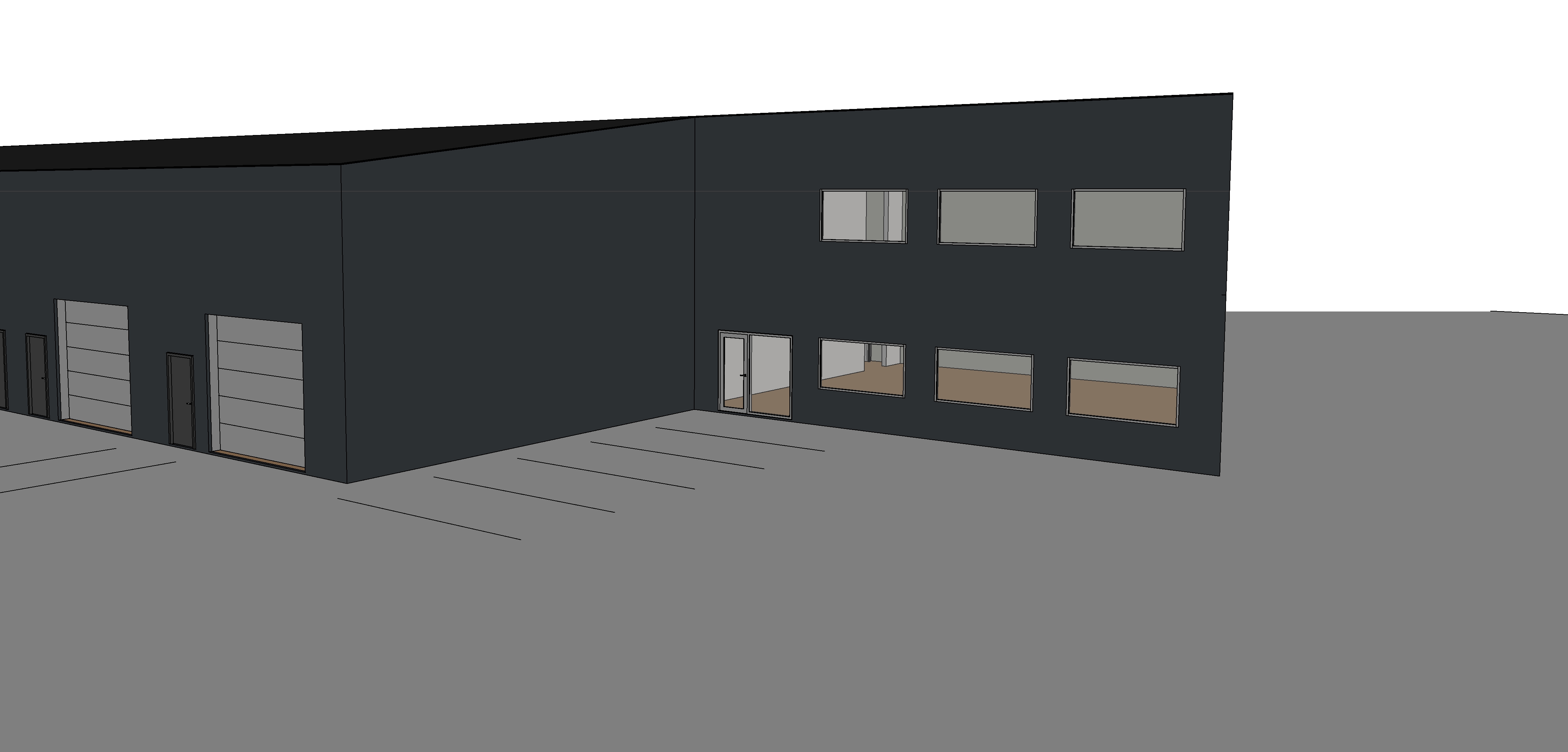ultra realistic render of the exact provided industrial building maintain the precise l shaped massing roofline wall angles window layout garage doors and entrance positions exactly as shown in the reference image do not redesign do not simplify geometry modern industrial facade finished entirely in smooth matte metal cladding in deep near black ral 7021 anthracite grey with subtle vertical panel joints and realistic roughness variation no exposed concrete anywhere on the building large sectional garage doors in matching dark industrial finish and a clean glazed entrance door on the office facade maintain the exact window sizes spacing and alignment on both floors site finished with dark asphalt parking lot surface including clearly painted white parking bay lines evenly spaced and aligned perpendicular to the building realistic road marking paint slightly worn but crisp include a continuous 1 meter light concrete pedestrian walkway around the building perimeter with clean sharp edges and construction joints lighting soft nordic overcast daylight neutral sky realistic industrial mood physically accurate shadows and reflections camera eye level three quarter architectural view showing both the warehouse volume and the office facade slight wide professional architectural lens ultra realistic materials high detail metal panels asphalt grain painted parking lines and glass reflections physically based rendering hyper realistic architectural visualization quality 8k resolution