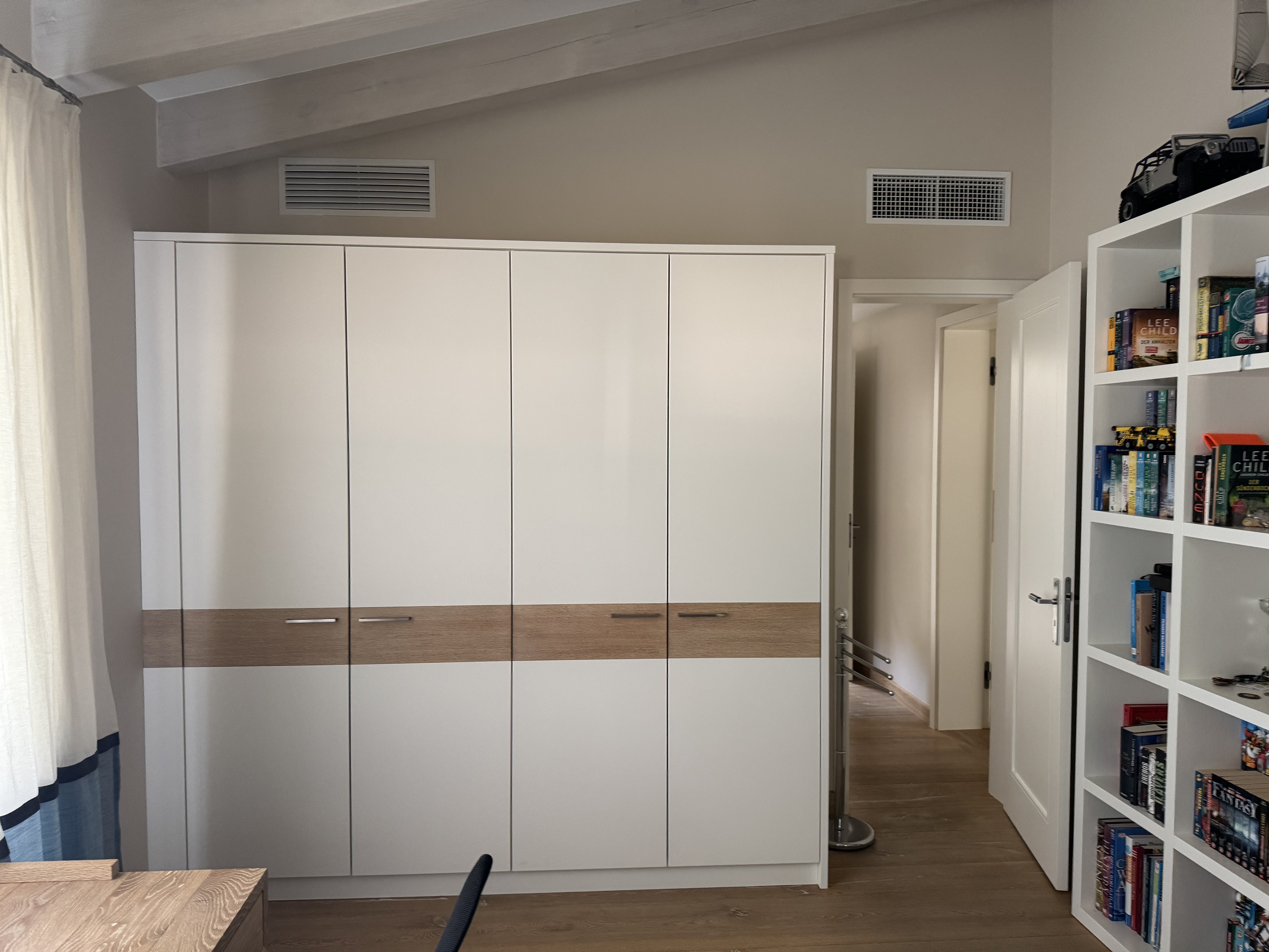 remove bed i need bookshelfs and sleepingsofa leave the small windows free no high shelves infront of it