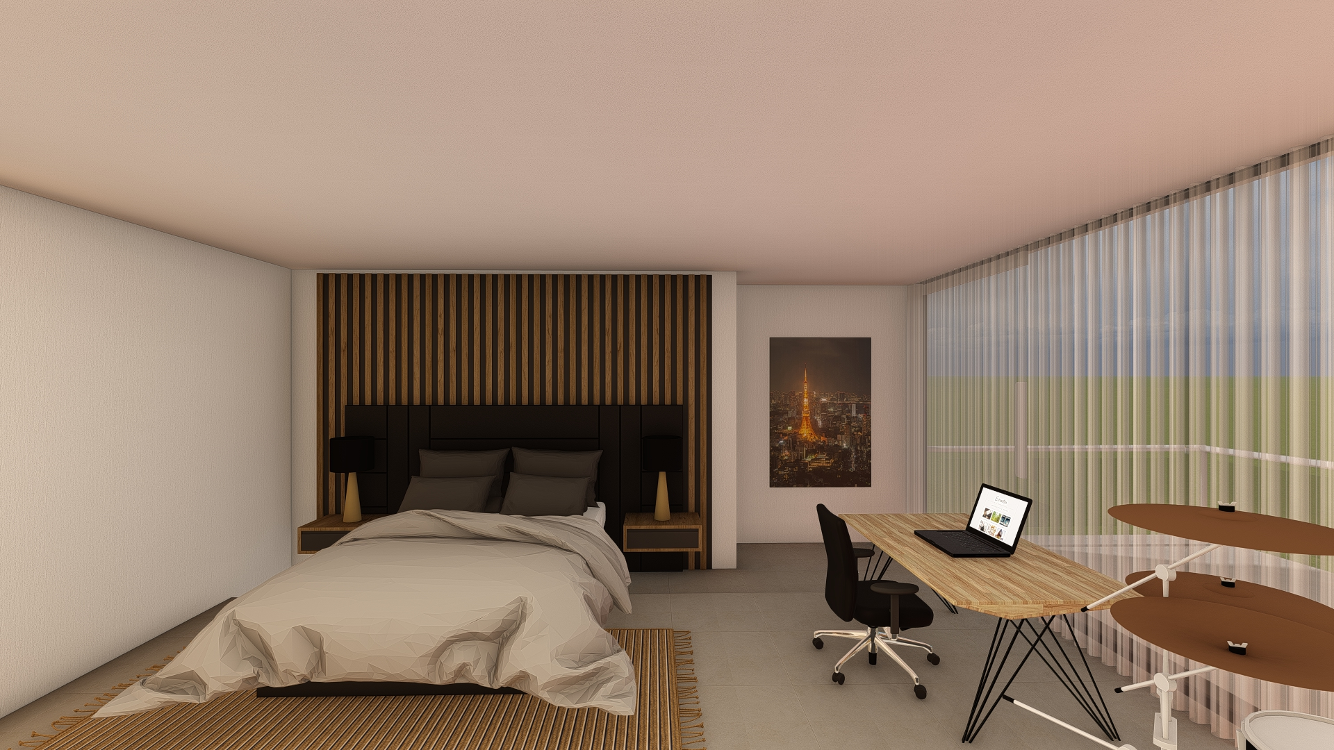 ultra realistic interior render of a modern bed room same layout and furniture as reference warm diffused glow no visible light source architectural lighting detail similar to high end minimal japanese european interiors global illumination soft shadows photoreal materials 8k cinematic daylight calm atmosphere emphasis on depth and material realism no extra fixtures no spotlights no chandeliers
