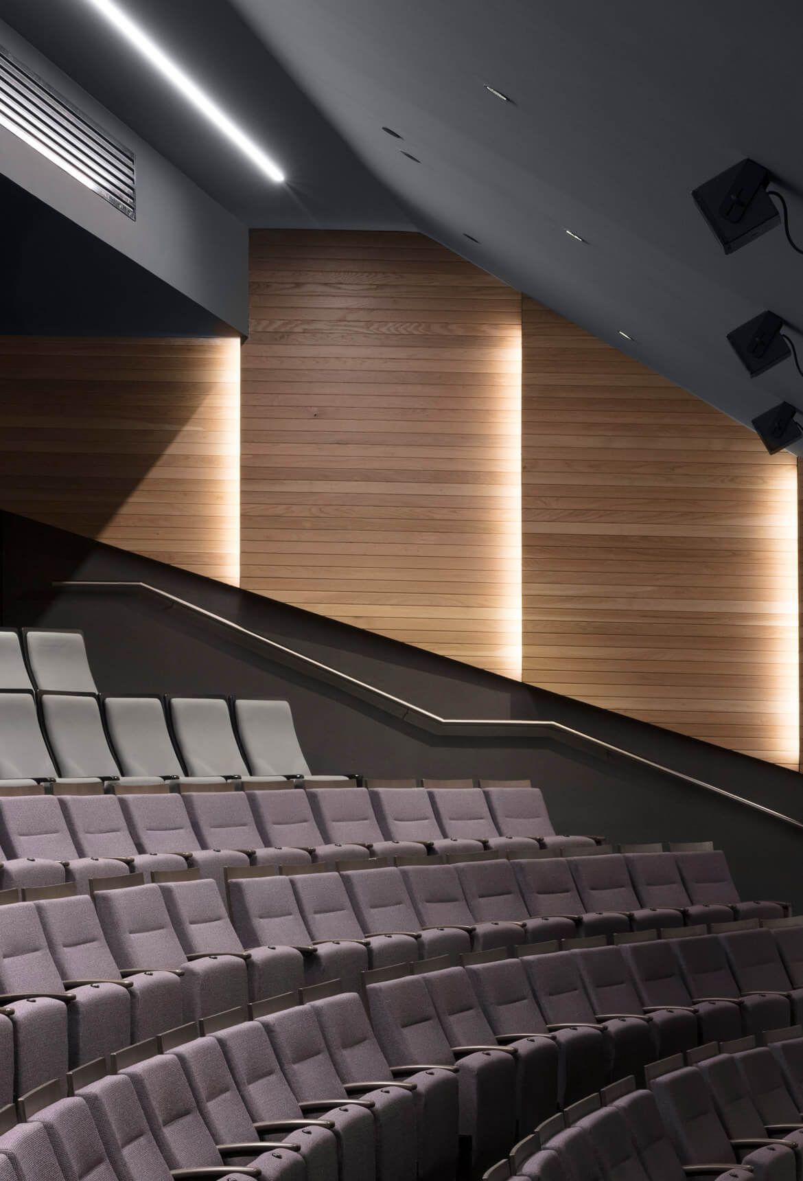 exterior shot auditorium interior please strictly follow the model geometry fill seatings and apply textures and colours led light from vertical panel edges black ceiling with spotlights black sidewalls lamelas black side doors carpet with grey and black modern pattern