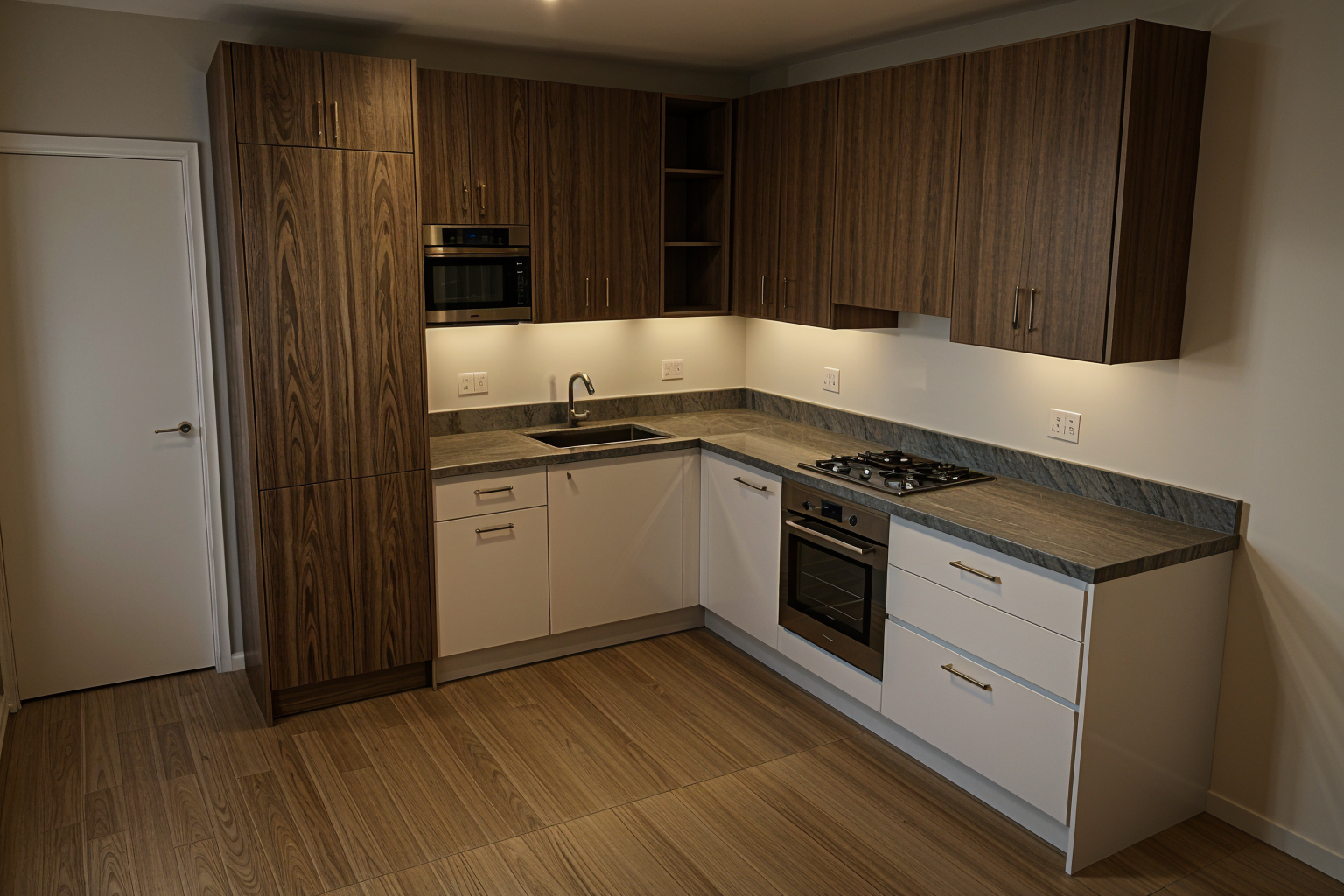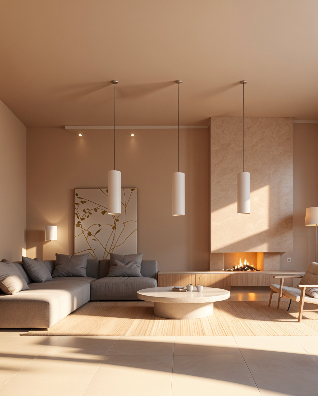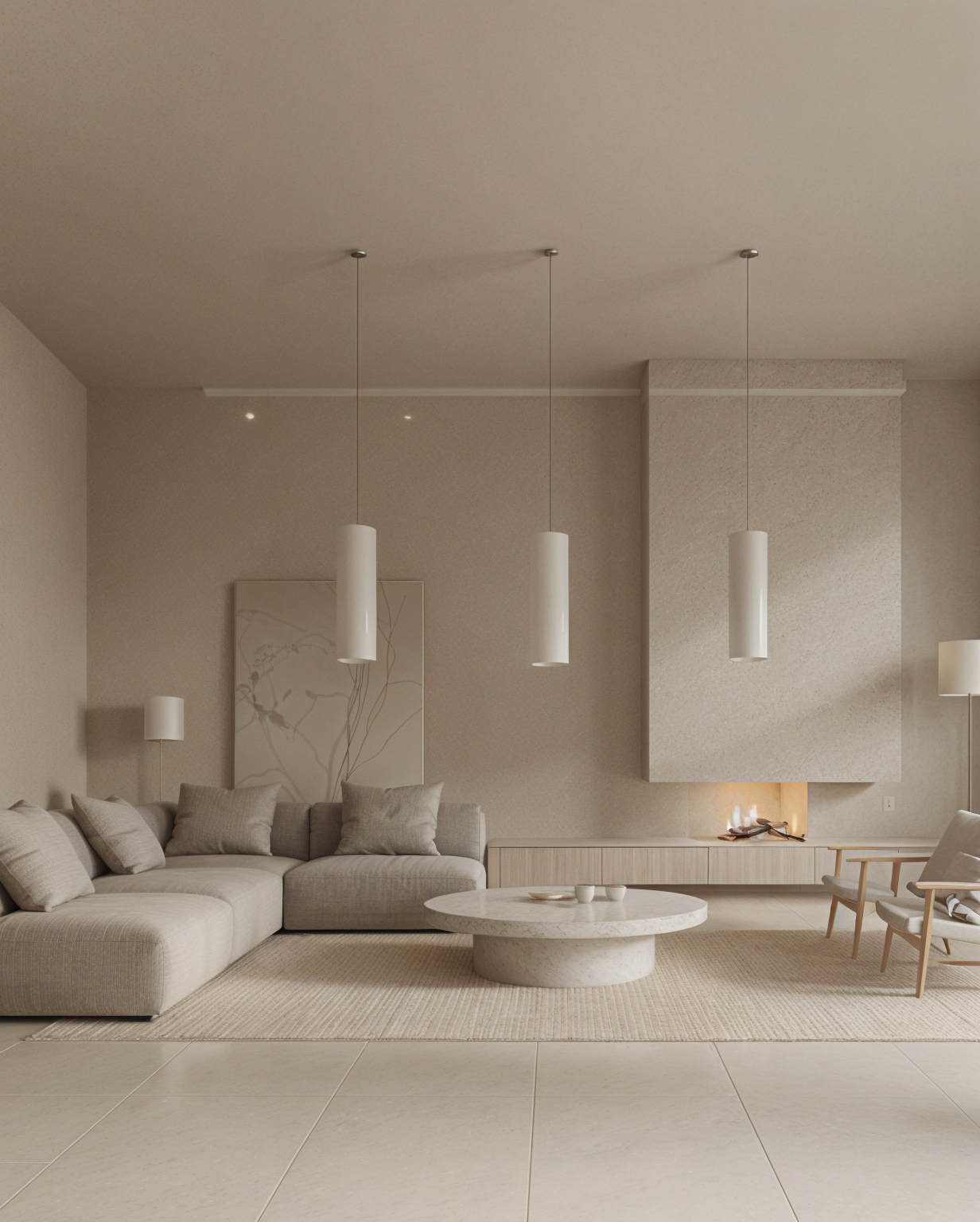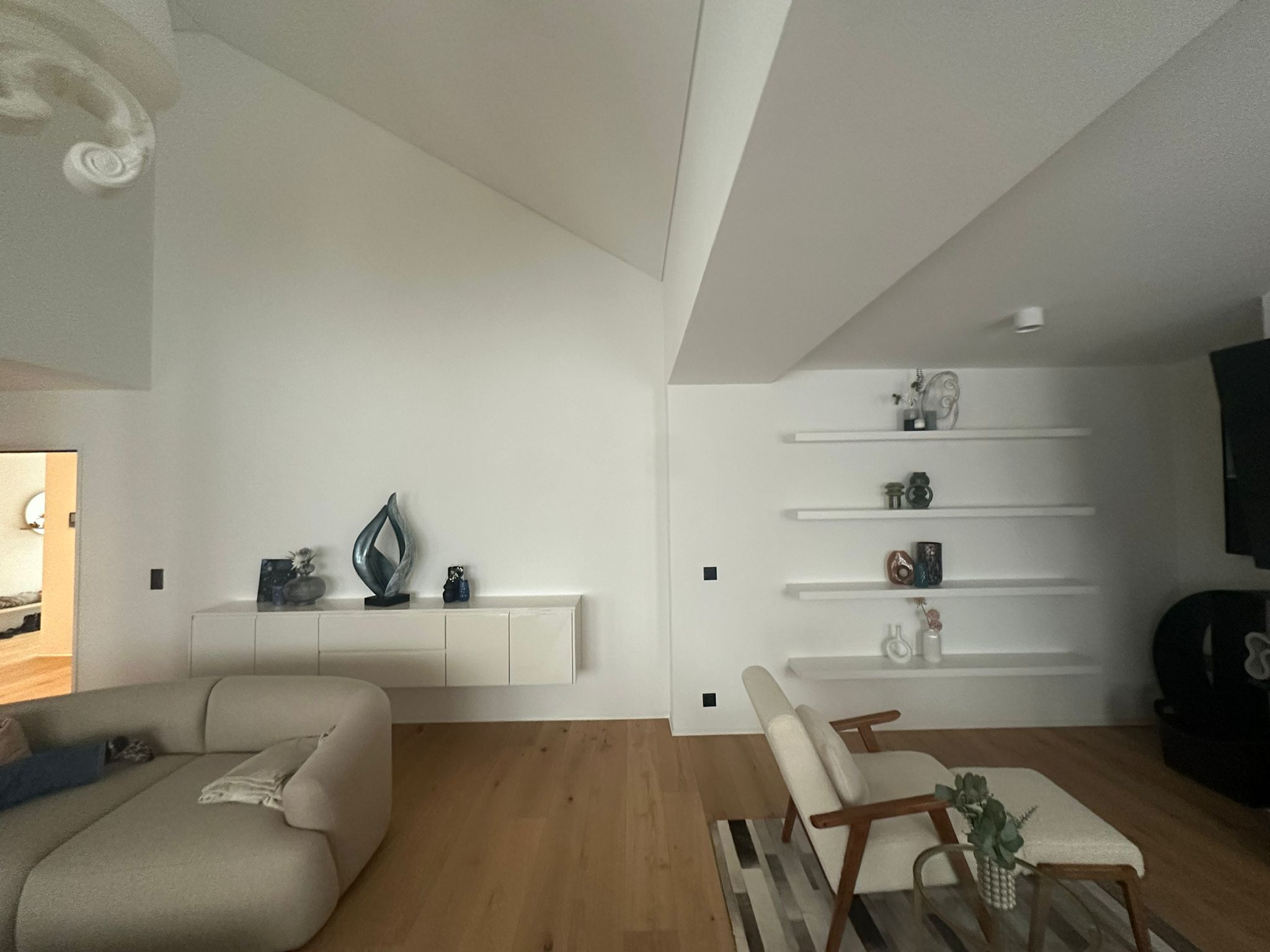 archsynth please integrate recessed wall shelves into the existing photo add two large recessed shelving niches with softly rounded arches at the top clean minimalistic edges and built in warm led strip lighting along each shelf include vertically ribbed backing panels inside the niches for texture the shelves should feature neutral toned ceramic decor in a modern sculptural style ensure the new recessed wall shelves blend seamlessly with the existing wall color lighting atmosphere and overall minimalist interior aesthetic