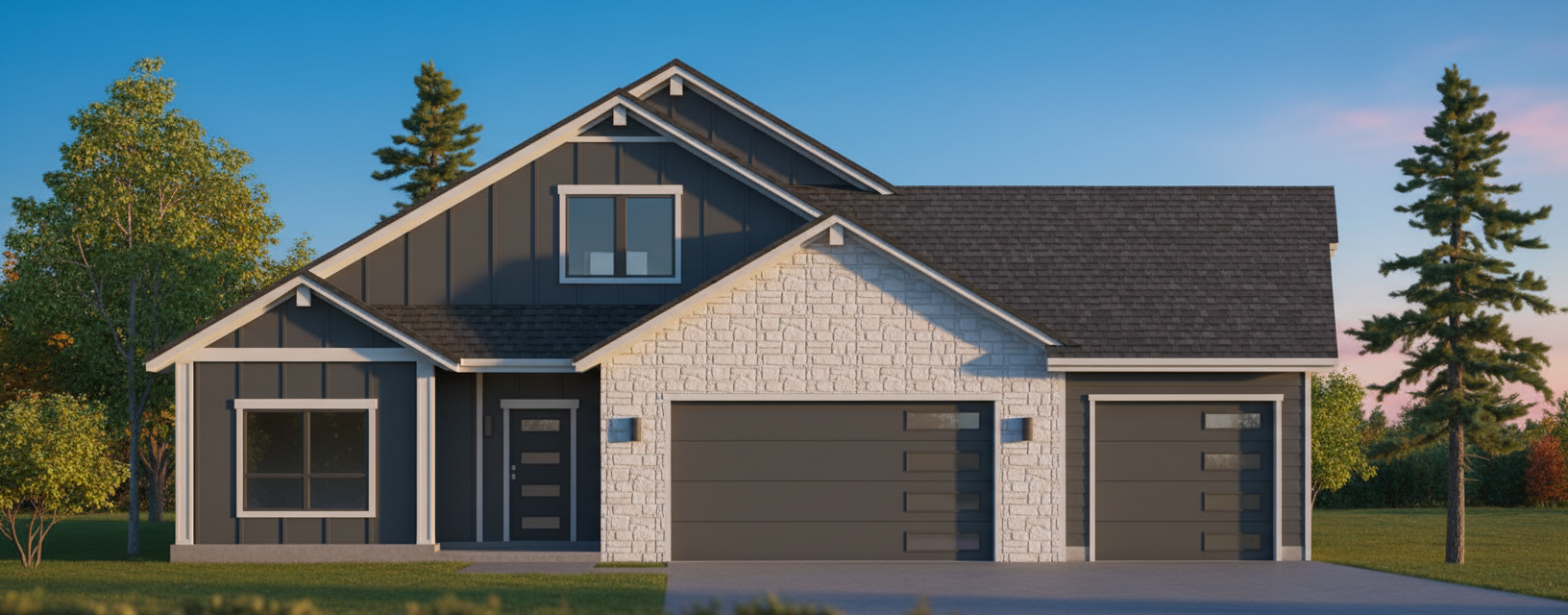 a charming creamy brick house with black accents bronze light fixtures on the exterior creamy neutral colors a manicured lawn with scattered pine trees and mountains in the back native plants found around the property