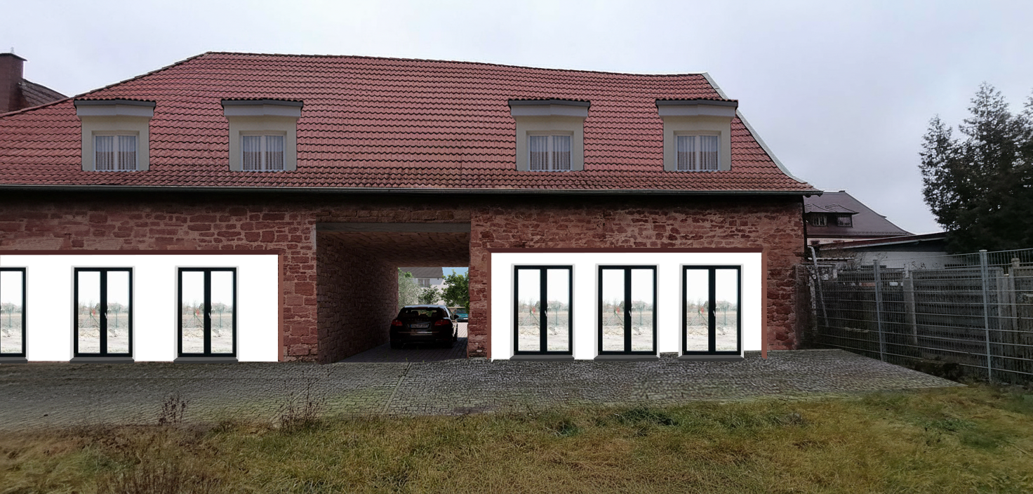 modernist exterior shot generate a photorealistic architectural render based on the provided photomontage important strictly preserve the existing composition geometry and architectural layout do not redesign or move elements facade main intervention focus on the white stucco wall at ground level this wall is slightly recessed approximately 15 cm from the brick facade visible depth between brick and stucco wall the wall has three large window doors floor to ceiling openings evenly spaced maintain their exact position proportions and spacing the window doors are also slightly recessed into the wall frames must be white aluminum clean and minimal the stucco should be off white cream with a subtle texture and realistic imperfections brick preserve the existing brick facade exactly as it is improving only realism texture and lighting tunnel passage improve the central tunnel where the car is located enhance depth lighting and shadows to make it realistic with natural light transition from exterior to interior pavement improve the ground surface using small square concrete pavers with grass between joints make them realistic with proper scale variation and detail window doors quality improve realism of glass reflections transparency frames and depth ensure they look properly integrated into the wall global improvement fix all visual inconsistencies from the photomontage improve lighting shadows materials and integration so the image looks like a real photograph photorealistic high detail natural daylight soft shadows physically based rendering architecture