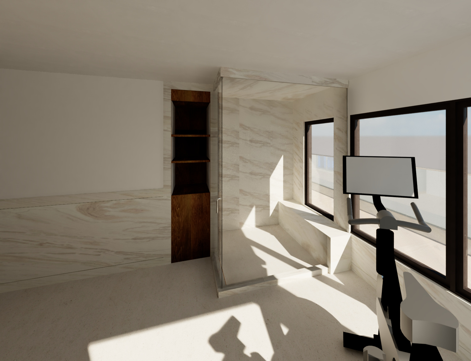 photorealistic render of a modern master bathroom strictly preserving the original geometry layout and proportions of the model materials vanity wood is a walnut veneer stain with realistic depth and subtle light refraction clean and uniform finish countertop backsplash wall wainscotting in a natural calacatta namibia marble white base with soft warm light blue grey veining natural satin finish floor is a natural light limestone in a large format square lighting bright natural daylight entering from windows balanced global illumination bright and natural avoid artificial showroom lighting environment clean elegant and contemporary bathroom realistic light illuminating on floor and furniture soft ambient occlusion to enhance depth under cabinets and along edges slight depth of field for a photographic look realism details very subtle imperfections on cabinetry accurate glass refraction and reflections in the mirror well defined but natural marble veining not exaggerated neutral color balance no overexposure on white surfaces camera wide angle lens 28 32mm camera height approx 155 165 cm frontal perspective slightly angled to show both the linear and corner keep vertical lines straight no distortion quality ultra realistic render high detail pbr materials global illumination ray tracing soft shadows realistic add minimal styling a few elegant vanity accessories on the countertop soap vase with lily flower slight warm tone in sunlight for a cozy and premium atmosphere enhance contrast for a warm residential look add ocean view in the windows