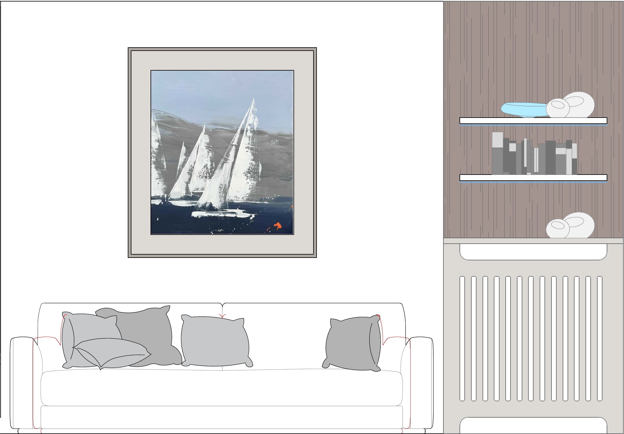 interior living room wall composition wall length 381 cm height 265 cm painted in light beige on the wall a picture in a black frame with a 10 cm wide passe partout below the picture a sofa 260 cm long upholstered in beige fabric to the right of the sofa a radiator cover 110 cm long 20 cm deep 120 cm high perforated pattern as per drawing colored in cashmere above the radiator cover wooden wall cladding with two shelves integrated led strip lighting shelves finished in cashmere color ceiling painted white floor finished with natural wood parquet clean modern warm and elegant interior atmosphere soft lighting realistic proportions