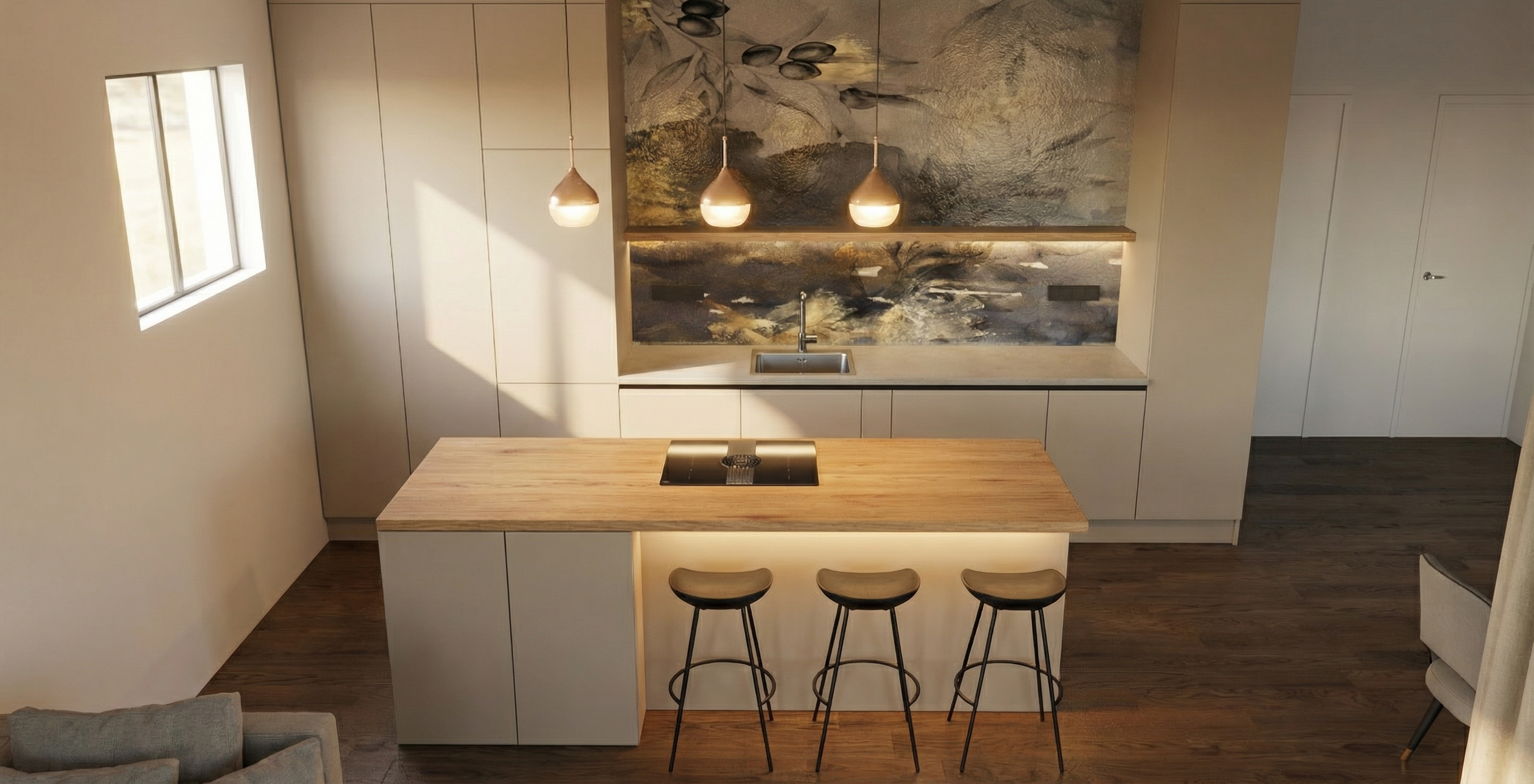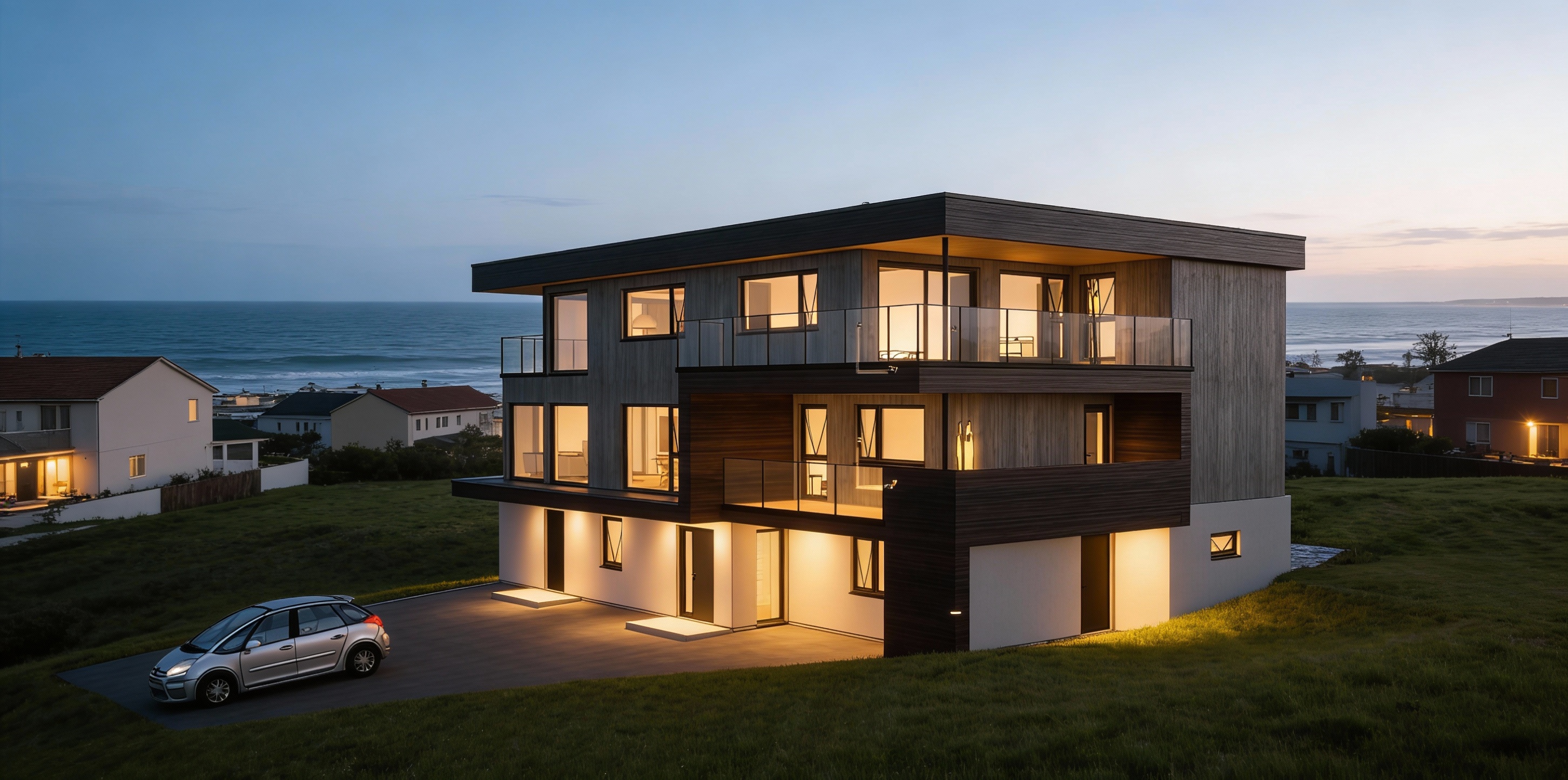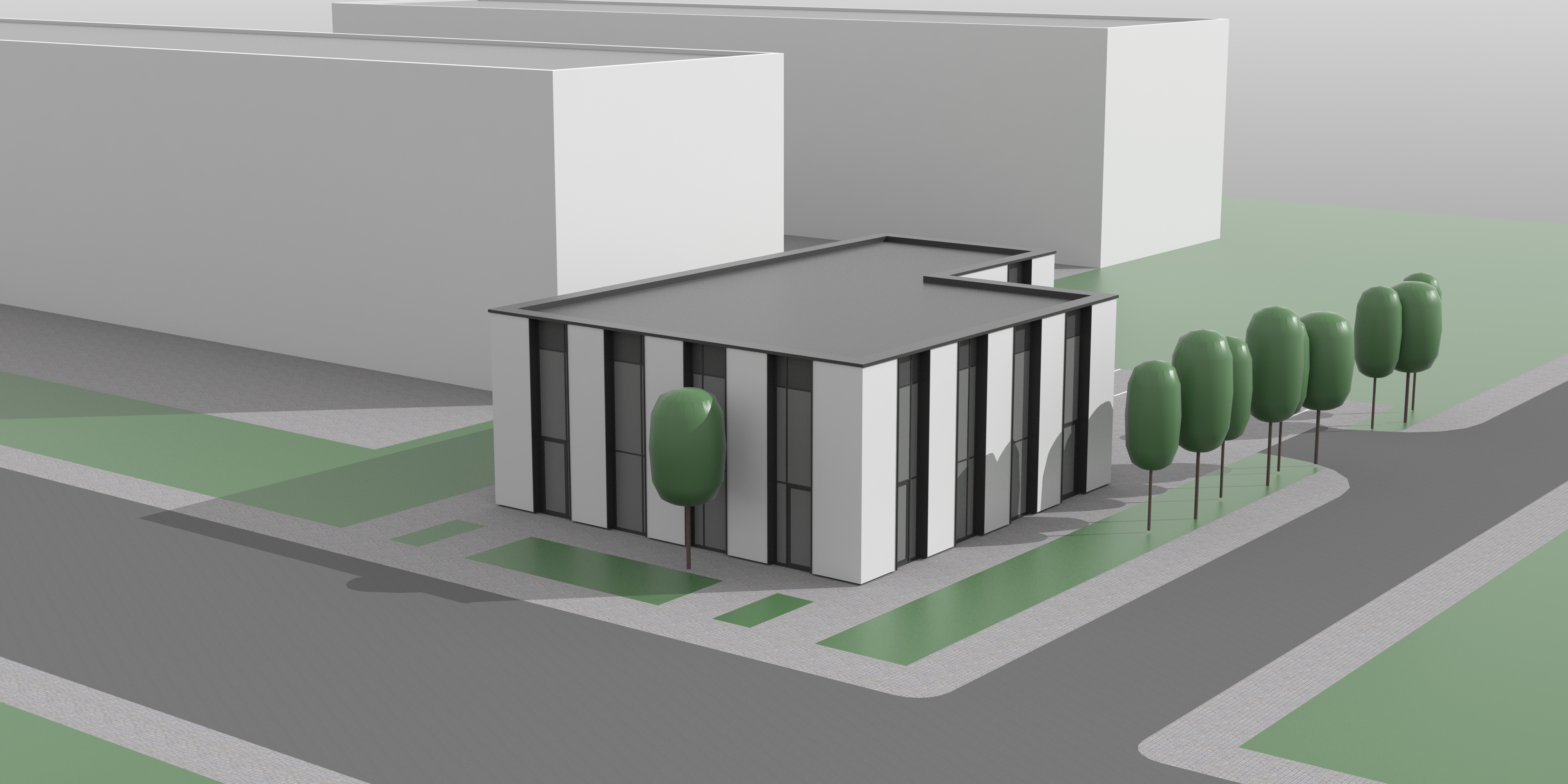 modern architectural scene featuring a small minimalist building with sleek lines and a flat rooftop with solar panels set against a backdrop of larger rectangular 4 story soviet apartment building in the distance the building fa ade is a blend of elongated white and light gray clinker tiles paired with large dark gray windows and gray tinned edges surrounding the structure are lush green trees lining the sidewalk adding a natural element to the urban setting the concrete pavement and asphalt roads are in shades of gray contrasted by patches of green grass the atmosphere is serene and contemporary with soft diffused lighting for a harmonious and inviting feel