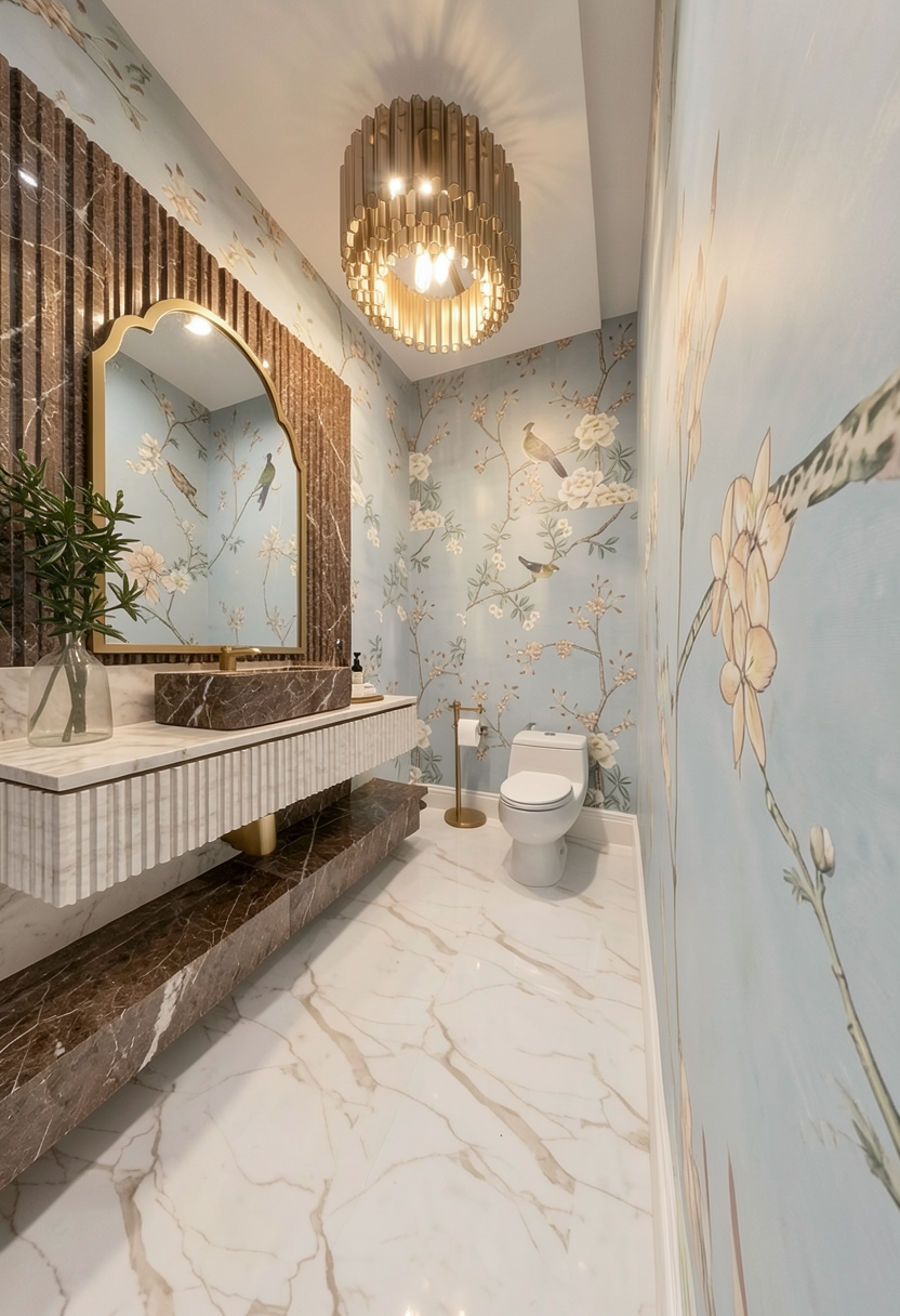 carrara marble in ridded vanity and light medium blue silk painted chinoiserie wallpaper sink in brown marble floor white carrara marble same vanity base of vanity and back of vanity in white carrara marble
