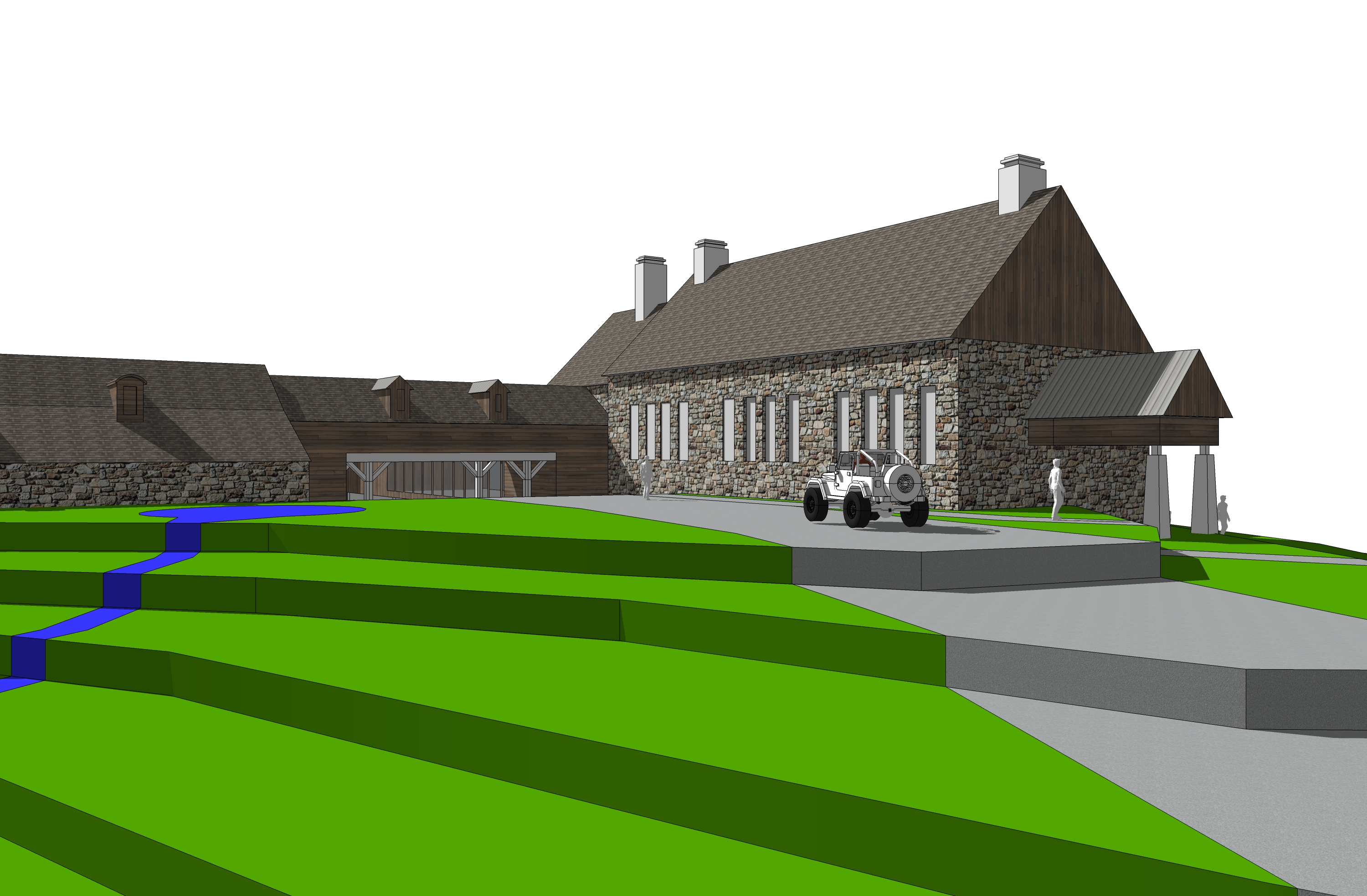 old stone farmhouse covered porte cochrere with vertical shiplap carriage house with dormers tall grass with driveway fog trees in background