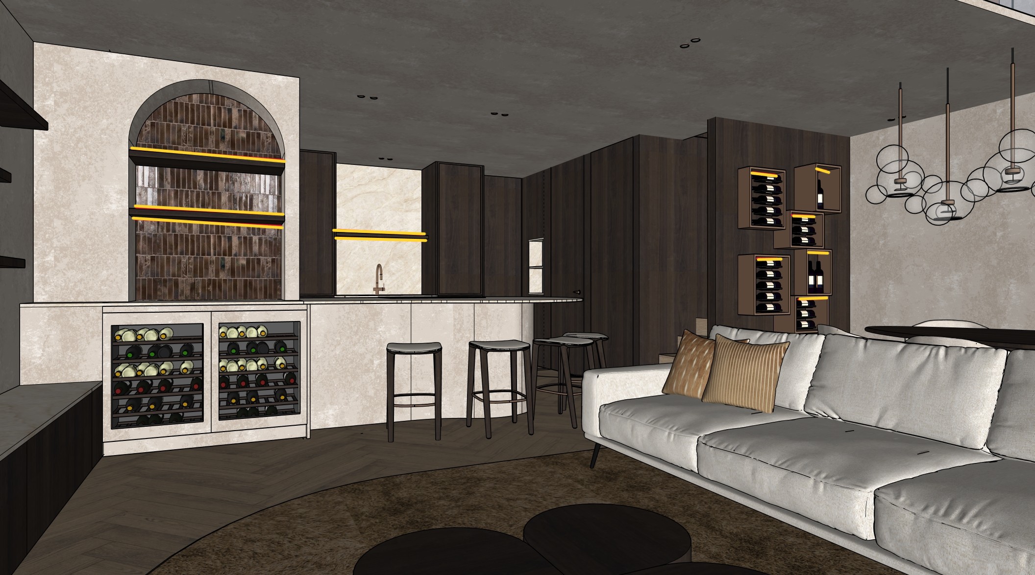 high end living kitchen arch with wine storage led strict camera match full scene definition ultra sharp pbr only no redesign create an ultra high end 4k ultra photorealistic architectural interior render based strictly on the uploaded reference image this viewpoint version with yellow led indication lines this is an existing interior design the complete spatial layout architectural structure wall positions ceiling geometry kitchen island bar arched niche boognis cabinetry wine storage dining area living area furniture placement lighting layout proportions and circulation must remain 100 identical to the reference image no redesign no reinterpretation no repositioning no added or removed elements camera must exactly match the reference treat the reference image as a camera matched architectural backplate camera image quality absolute lock exact same camera position height and distance same framing and crop same perspective and vanishing points architectural lens feeling 24 28 mm perfect verticals no distortion ultra sharp focus over the entire image no depth of field no blur no haze no fog no bloom crisp edges visible micro detail everywhere architecture geometry fixed open living space with kitchen bar and dining area kitchen island with integrated bar seating large arched niche behind the bar integrated wine coolers under the niche tall cabinet wall in dark veneer no ovens or built in appliances visible anywhere open niche to the right of the kitchen wall must remain and stay finished in stone dining area on the right under pendant lighting living area with sofa rug and coffee table all geometry alignments depths radii and proportions must be identical to the reference image no sharp corners soft natural rounding everywhere arched niche fully seamless walls ceiling not flat critical walls and ceilings identical to reference subtle textured mineral plaster visible depth matte not flat no flat walls no flat ceilings no visible seams or joints wood elements strict match applies to all cabinetry shelves bar structure coffee table dining table material dark wood veneer identical tone to reference seamless pbr textures correct grain direction satin matte lacquer visible pores and depth cabinets at sink framed doors hard lock tall cabinets left and right of the sink framed doors mandatory frame width exactly 15 mm same dark veneer as other cabinetry subtly rounded edges no flat slab doors no interpretation stone taj mahal quartzite satin applies to countertop on left lower cabinets mandatory bar island countertop backsplash behind faucet open niche right of the kitchen wall mandatory properties taj mahal quartzite satin finish soft natural sheen visible mineral veining no high gloss arched niche tiles decoration tiles identical to reference same size layout and positioning realistic ceramic glaze seamless integration decoration exactly 3 transparent wine glasses ultra clear glass balanced spacing no other decorative objects wine storage final lock wine coolers under arched niche wine cooler front panels finished in the same material as the surrounding walls no stainless steel no black glass fronts fully integrated look bottles all bottles transparent glass clear to lightly smoked visible liquid level right side wine display niches all frames around wine bottles must be copper brushed copper finish warm metallic reflections bottles in these niches dark green deep brown or smoked glass allowed all bottles each bottle unique different shapes bordeaux burgundy unique labels and capsules muted elegant colors only no bright or saturated colors led strips exactly as in reference led strips must be placed exactly according to the yellow lines arched niche one led under upper shelf one led above lower shelf horizontal led behind faucet niche led strips integrated in copper wine frames on the right properties warm neutral 2700 3000k indirect architectural glow no visible led source no additional leds other lighting ceiling spots copper colored realistic beam spread and fall off pendant above dining table glass globe pendants multiple glass spheres copper suspension warm light floor realism lock hungarian point herringbone layout identical direction and scale clear wood grain subtle surface relief natural satin sheen directional reflections furniture locked all chairs identical to reference sofa beige linen visible weave natural folds cushions pattern identical natural volume legs black aluminum rug brown locked high pile fluffy brown identical to reference matte fibers no beige no copper no grey lighting setup soft natural daylight from behind the camera balanced exposure no dramatic contrast no cinematic lighting negative prompt mandatory ovens appliances cgi look illustration cinematic lighting flat walls flat ceilings visible seams wrong stone wrong wood flat cabinet doors missing framed doors wrong frame width non copper wine frames stainless steel wine fridges plastic materials repeated bottles dark bottles in wine coolers wrong rug color extra leds blur haze fog bloom people clutter game engine look