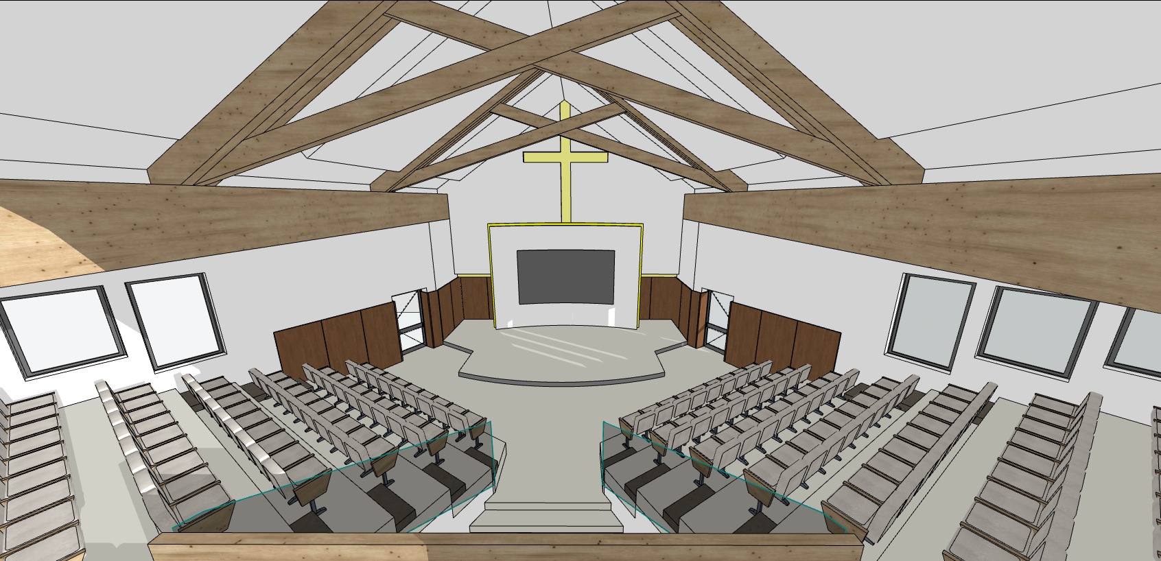 prompt en recomandat pentru archsynth create a photorealistic interior render based exactly on the provided church image keep the exact same architecture ceiling shape exposed wooden trusses stage position seating layout wall geometry windows proportions and overall composition do not redesign the space preserve the existing materials and warm wood accents add warm indirect backlight inside the large ceiling panels ceiling coffers so the ceiling design glows softly and evenly add integrated warm led strip lighting inside the vertical wooden wall panels on both sides of the stage creating elegant illuminated accent panels add full window treatments on all visible windows soft white sheer curtains perdele plus elegant warm neutral drapes draperii layered and realistic suitable for a pentecostal church interior place a few people on the stage in the center a pastor standing naturally and speaking around him add a few worship team members singers in a subtle respectful way keep the stage balanced and not crowded on the main screen display a clean christian pentecostal visual such as an open bible verse a worship lyric slide or a simple cross and bible themed church presentation elegant and believable for a pentecostal service make the atmosphere brighter warm welcoming reverent and realistic with soft natural daylight entering through the windows plus warm 3000k layered interior lighting maintain a refined modern pentecostal church aesthetic