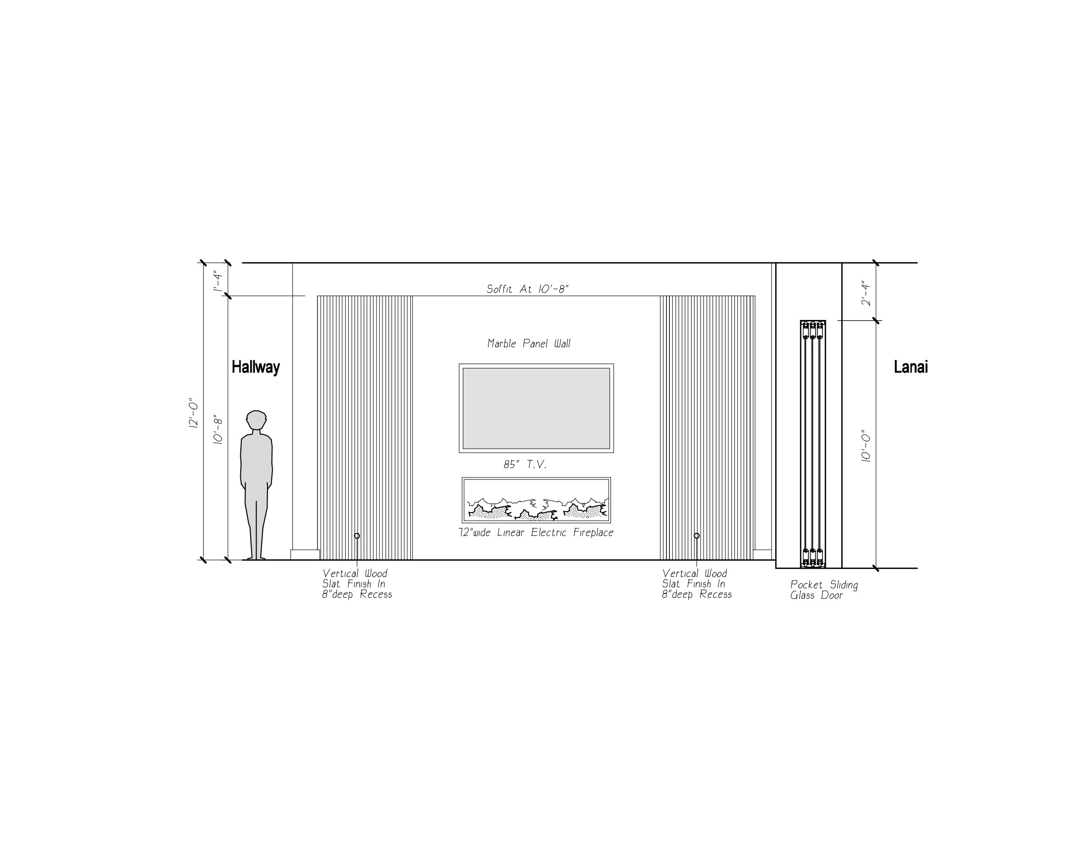 dark wood slat wall recessed 8 dappled gray marble finish on tv wall flat screen tv with ocean beach scene dappled gray tile floor white walls white walls in hallway sun beam into living area