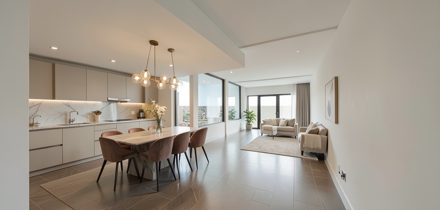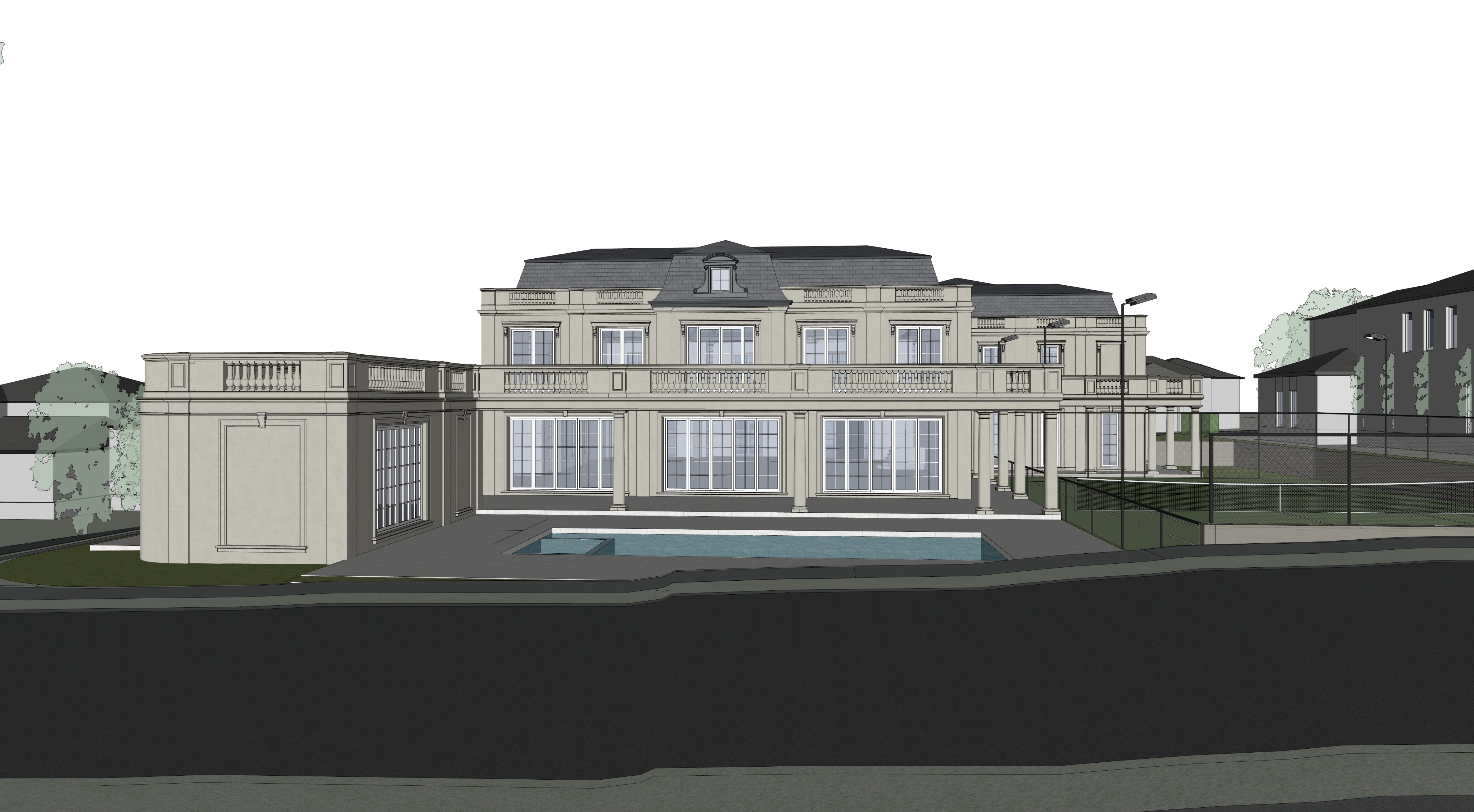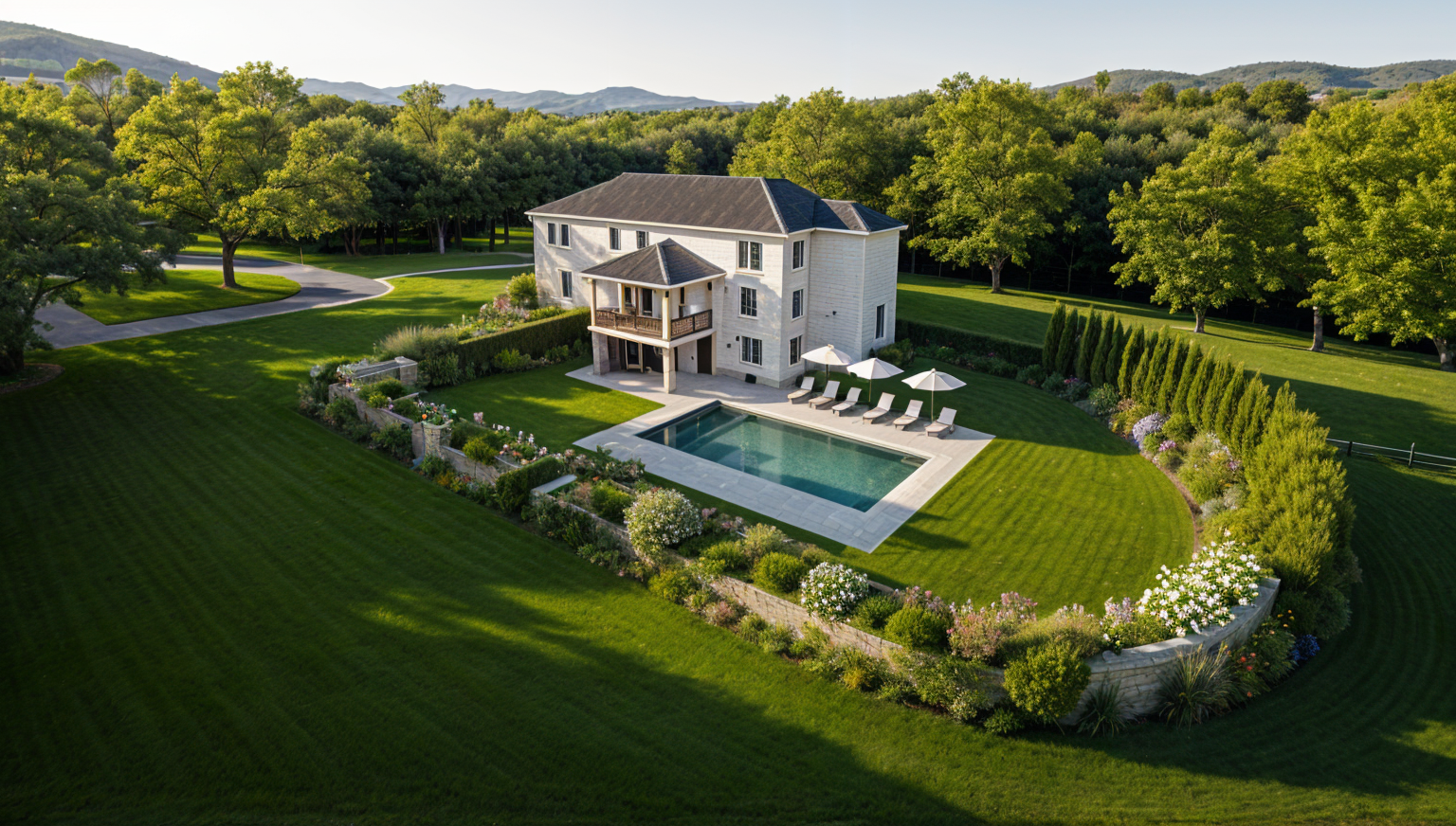photorealistic render canon eos 5d classical home high green hedges fence dramatic lighting award winning late afternoon slate roofing wet road pedestrian gate with two vehiecular gates on the side diffused light on the curated objects within which reflect a blend of natural textures the composition should be balanced and serene evoking a sense of high end artistry with subtle reflections of the internal light the overall image should be sharp exquisite detail from the texture of the building materials to the softness of the light glow