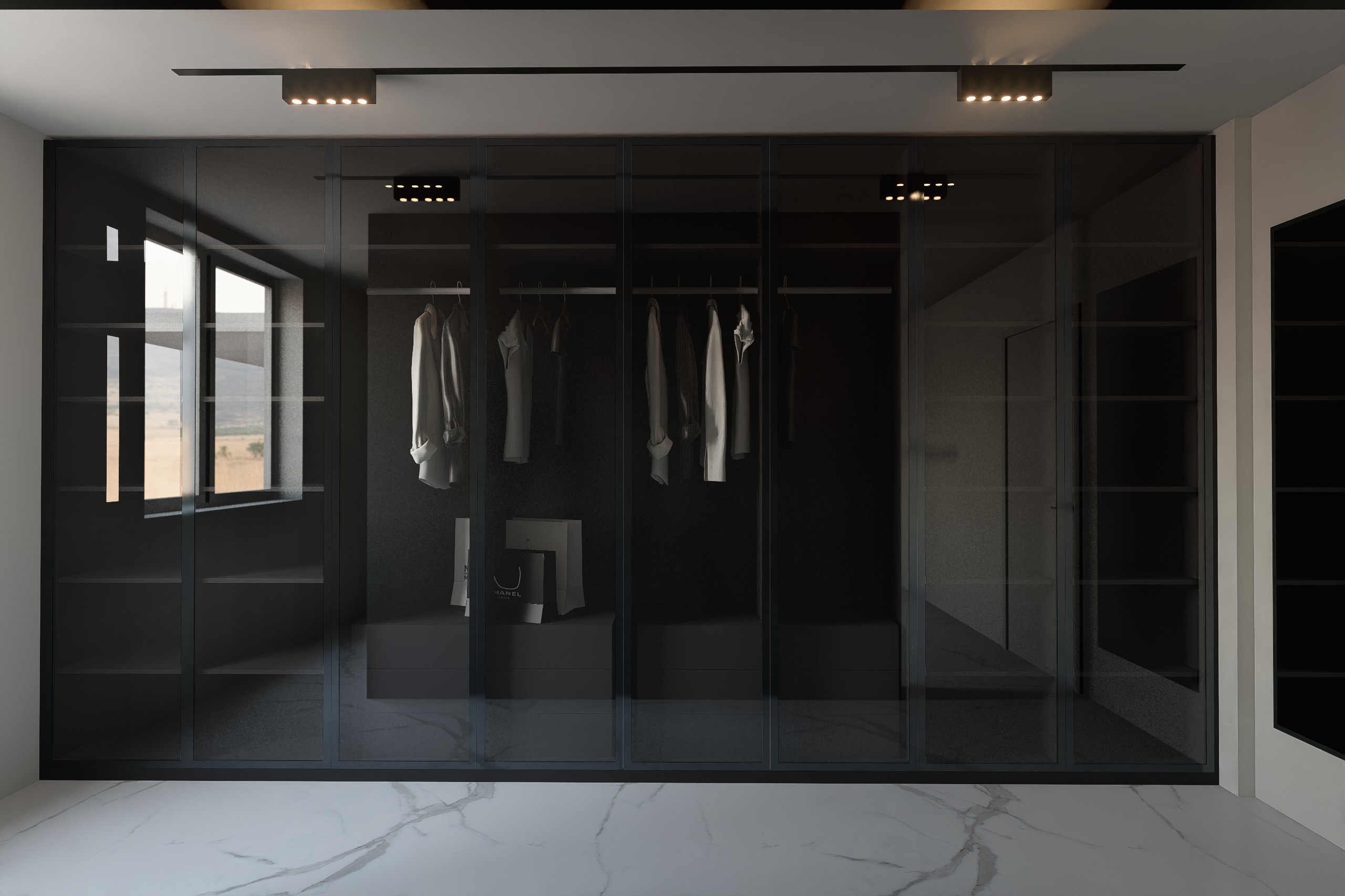ultra realistic render of this exact wardrobe design keep the same layout same proportions same number of sections same glass doors same shelves same hanging zones same framing same camera angle and same overall composition do not change the wardrobe design at all only enhance it by styling the interior and lighting to make it feel more modern premium and realistic add integrated led lighting inside the wardrobe warm white led around 3000k 3500k hidden linear led strips integrated vertically or under shelves elegant and minimal not visible as bulky fixtures soft even glow inside each compartment luxury modern wardrobe showroom feel realistic light spread and reflections on the glass add clothes and styling elements inside the wardrobe but keep it clean and minimal a few premium hanging clothes in neutral tones like black white beige grey some folded clothes on selected shelves a few luxury accessories such as a handbag or box if needed styling should be balanced and refined not crowded keep some empty space so it still looks elegant and architectural material treatment keep the dark wardrobe finish in a rich anthracite black charcoal tone keep the smoked or dark glass look elegant and realistic improve reflections on the glass so they feel natural and premium make shelves panels and frames look seamless and high end preserve the floor and surroundings exactly as they are rendering quality ultra realistic materials soft realistic shadows believable reflections in the glass premium interior lighting mood modern luxury wardrobe showroom atmosphere clean sharp high end architectural visualization important do not change the wardrobe layout do not change the glass door design do not add extra divisions do not move shelves or hanging rods do not redesign anything only add clothes subtle accessories and integrated led lighting negative prompt do not change design do not change wardrobe layout do not change proportions no redesign no extra shelves no extra compartments no different door style no open wardrobe redesign no overcrowded clothes no colorful clothes no messy styling no harsh lighting no visible bulky led fixtures no fake reflections no low realism
