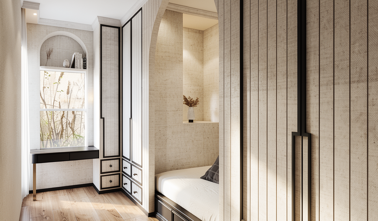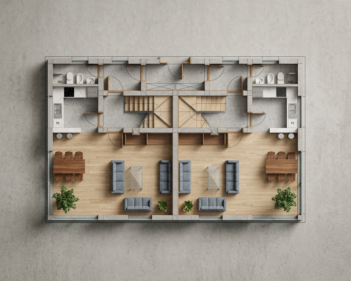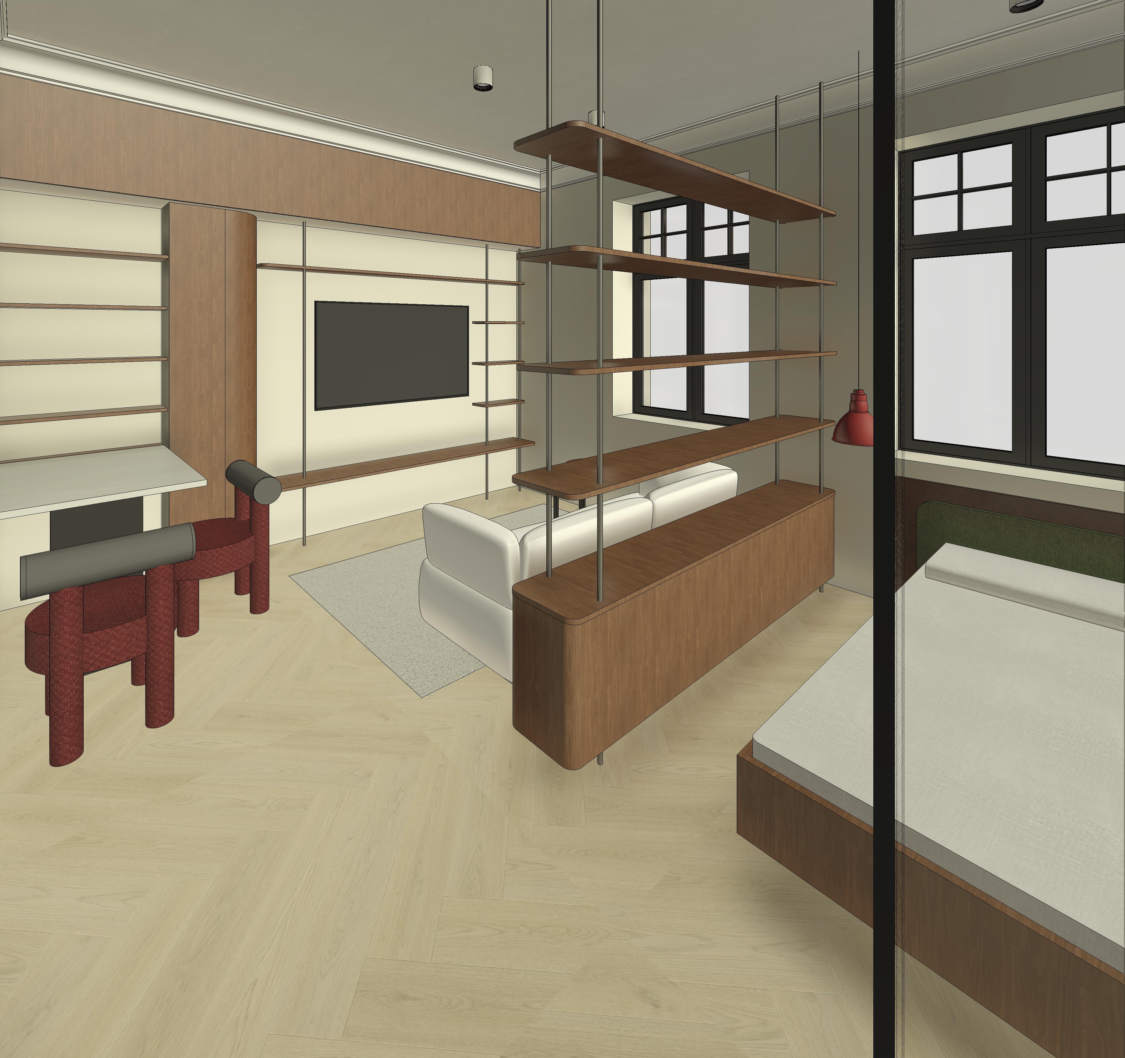 create a photorealistic architectural visualization based strictly on the provided revit view of the living room do not change the geometry layout proportions furniture placement camera angle or architectural elements preserve the exact design from the source image materials and details all furniture should be finished in warm walnut wood with natural wood grain the chairs must be completely deep burgundy replace the current grey headrest upholstery with deep burgundy so the entire chair seat backrest and headrest appears burgundy the rug should be light colored soft beige or light cream with a subtle texture to brighten the interior windows add light curtains next to the windows the curtains should be light airy and neutral white or soft beige fabric and hang naturally curtains should look minimal and elegant allowing natural daylight to pass through lighting add realistic interior lighting with soft natural daylight and subtle artificial lighting to enhance depth and realism use physically accurate shadows reflections and global illumination rendering style ultra realistic materials and textures high quality reflections soft shadows and ambient occlusion architectural interior photography style elegant modern interior atmosphere important do not redesign move add or remove any objects except for the curtains keep the original revit composition exactly the same and only improve realism lighting and the specified materials