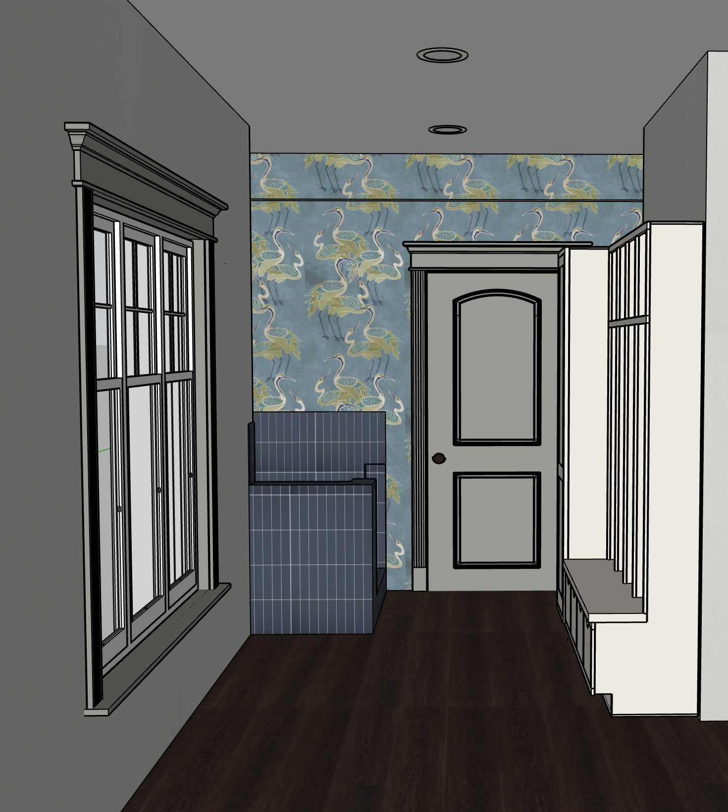 render with indirect midday natural light from window render with 25 recessed light wall color is sherwin williams sea salt door and all trim is sherwin williams oyster bay wallpaper is as shown