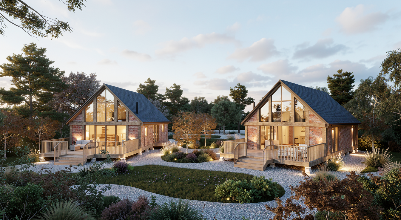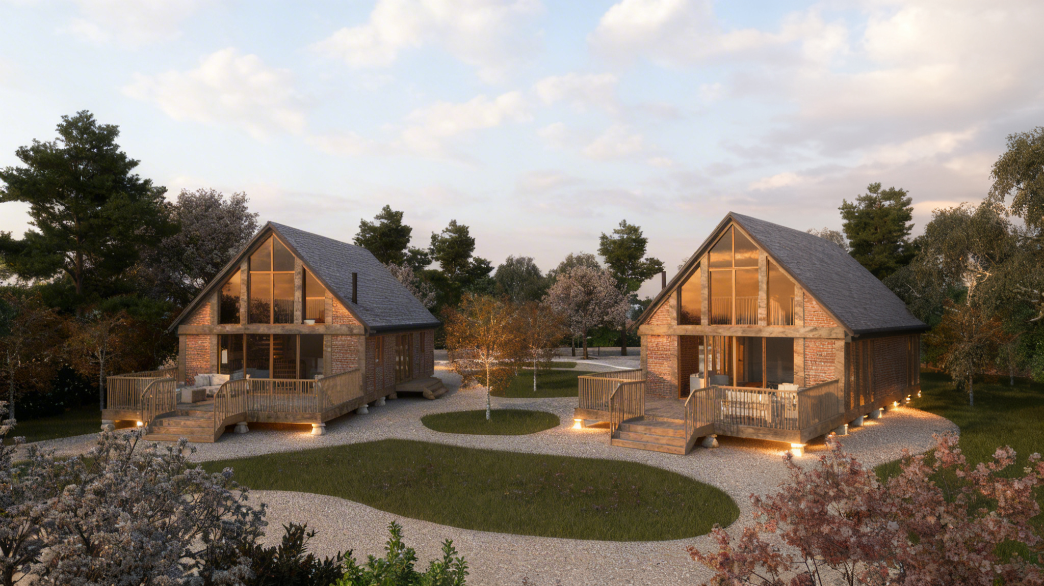 create an architectural render of two staddle stone lodges the lodges are made from brick with timber framing the front facade of each lodge has glazing between the timber framing with the reflection of the surroundings at the front of both lodges is a timber terrace the staddle stones below each lodge are very small in size surrounding the lodges is soft planting and shrubs with gravel paths in the background is low level trees there is natural lighting with some soft clouds ambient lighting