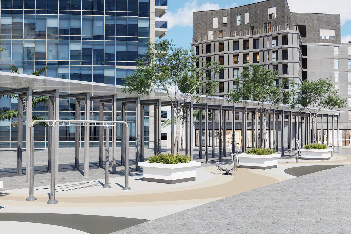 dont change the fitness dont change the floor colour this is outdooe fitness at the left side is glass corridor add some shrubs