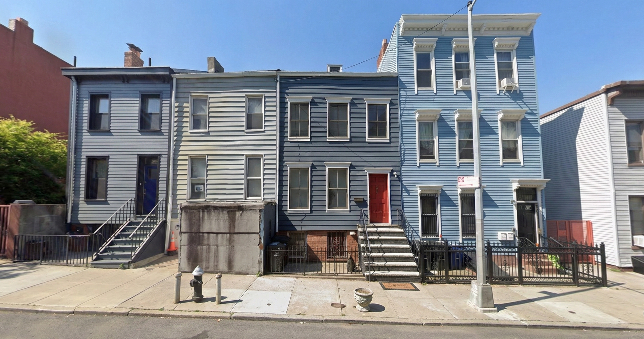 recreate exterior elevation of white house 2nd from left in the image to cream colored brick and black framed windows add stairs and doors like the house next door