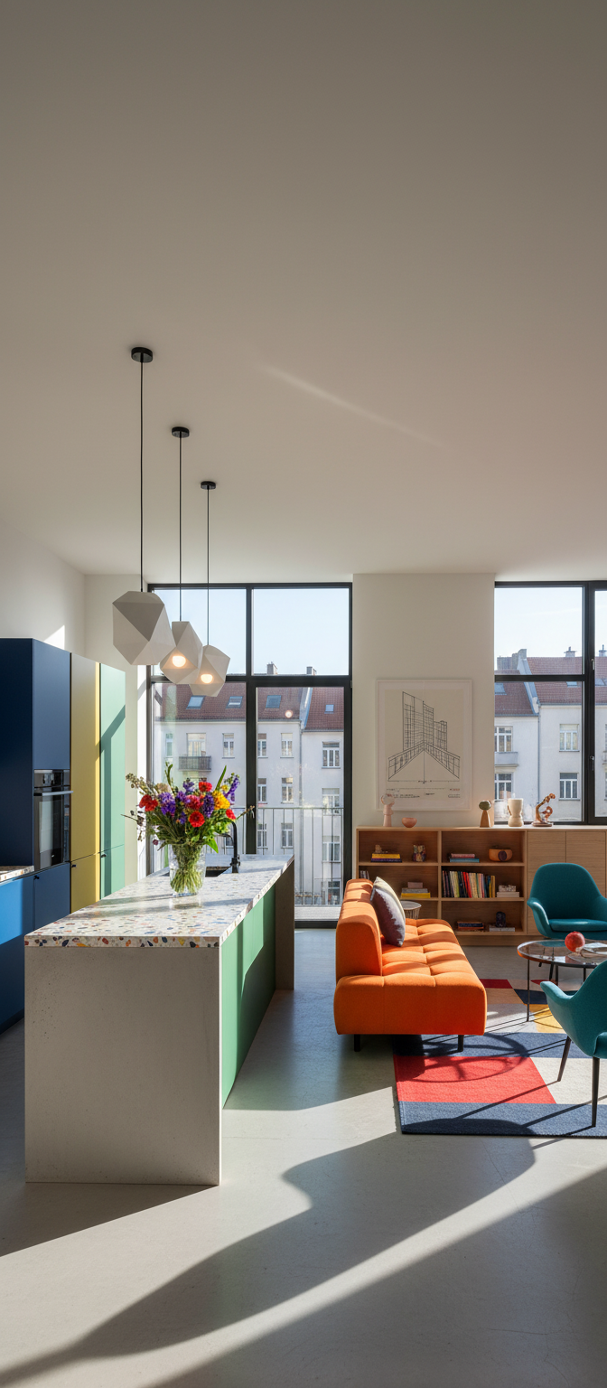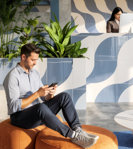 make this two people ultrarealistic define their face and clothes man add a european man in a suit sitting only on the fully visible orange pouf in the foreground center left he must be clearly seated on the pouf with his weight resting on it not touching the stairs not sitting on any other surface natural posture looking at his phone table add a glass water bottle and a drinking glass on the table important constraints do not modify architecture furniture materials lighting or composition do not move elements do not change camera ultra realistic result natural skin correct anatomy proper shadows no ai artifacts no plastic look