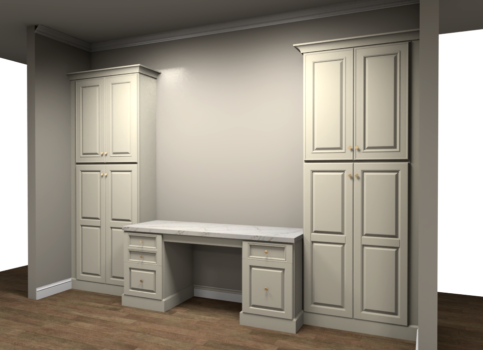 create a hyper realistic photo from this built in desk rendering add decor art on the wall and a chair underneath the desk soft sunlight streaming in