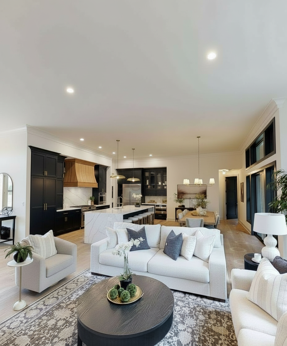 high quality top down architectural floor plan rendering enhance the existing 2d plan with realistic materials soft shadows and depth while preserving the exact layout walls room sizes and furniture placement wood flooring should have natural grain and variation tile and stone areas should read clearly and cleanly furniture should feel dimensional and styled but remain consistent with the original plan add subtle shadows highlights and ambient lighting for clarity and hierarchy include soft greenery in outdoor or courtyard areas where shown overall look should be polished warm and presentation ready similar to a professionally rendered floor plan do not redesign or alter the plan