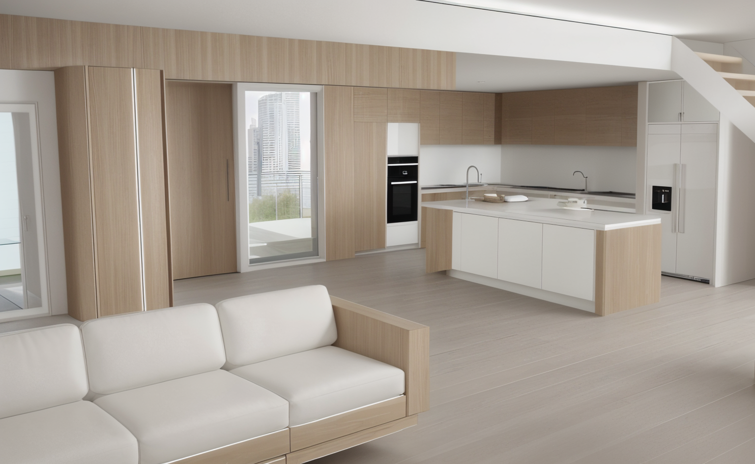 interior shot warm concrete floors with complementary countertops and backsplash trees seen through window