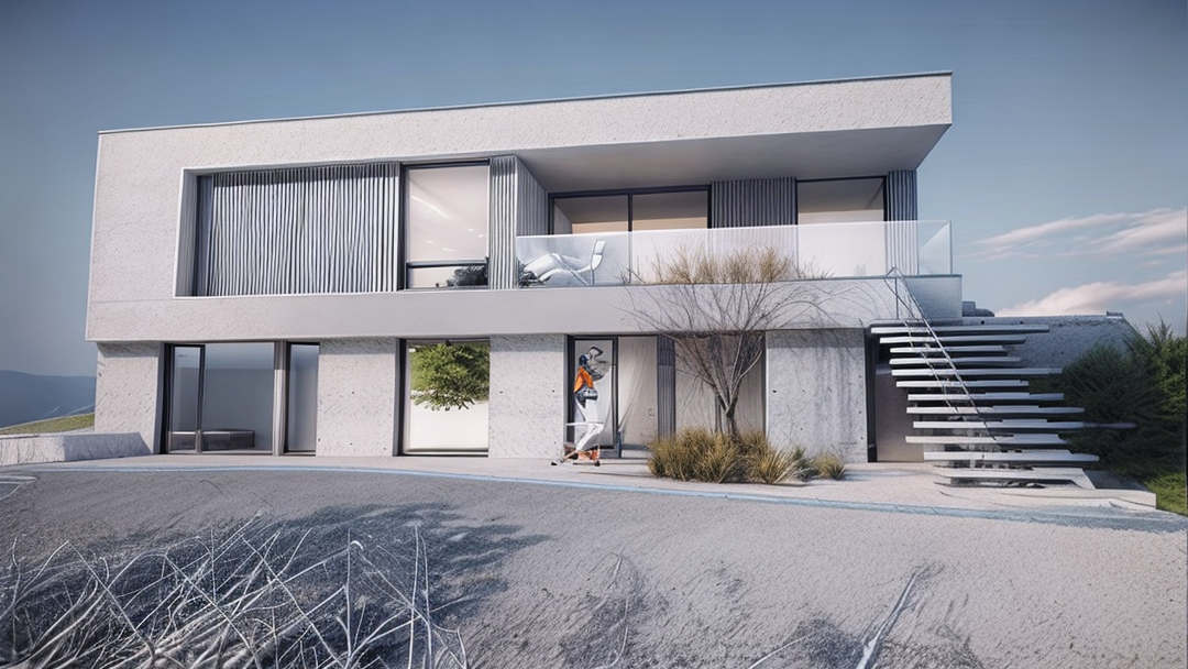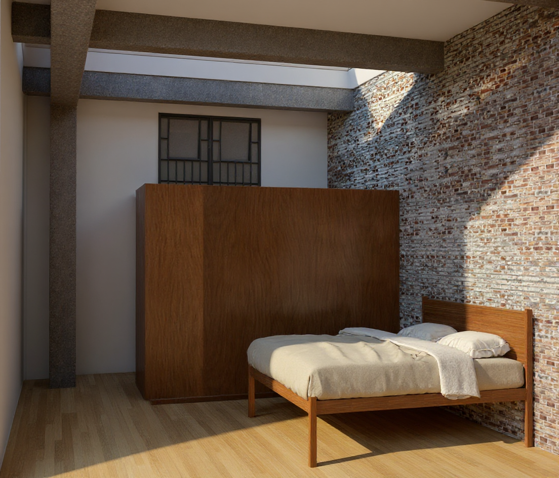 maintain the existing geometry as much as possible maintain the curved wall behind the concrete column render this image to make it look as realistic as possible adding realistic textures to materials and realistic lighting to the space maintain shadow shape from direct light coming in through the skylight