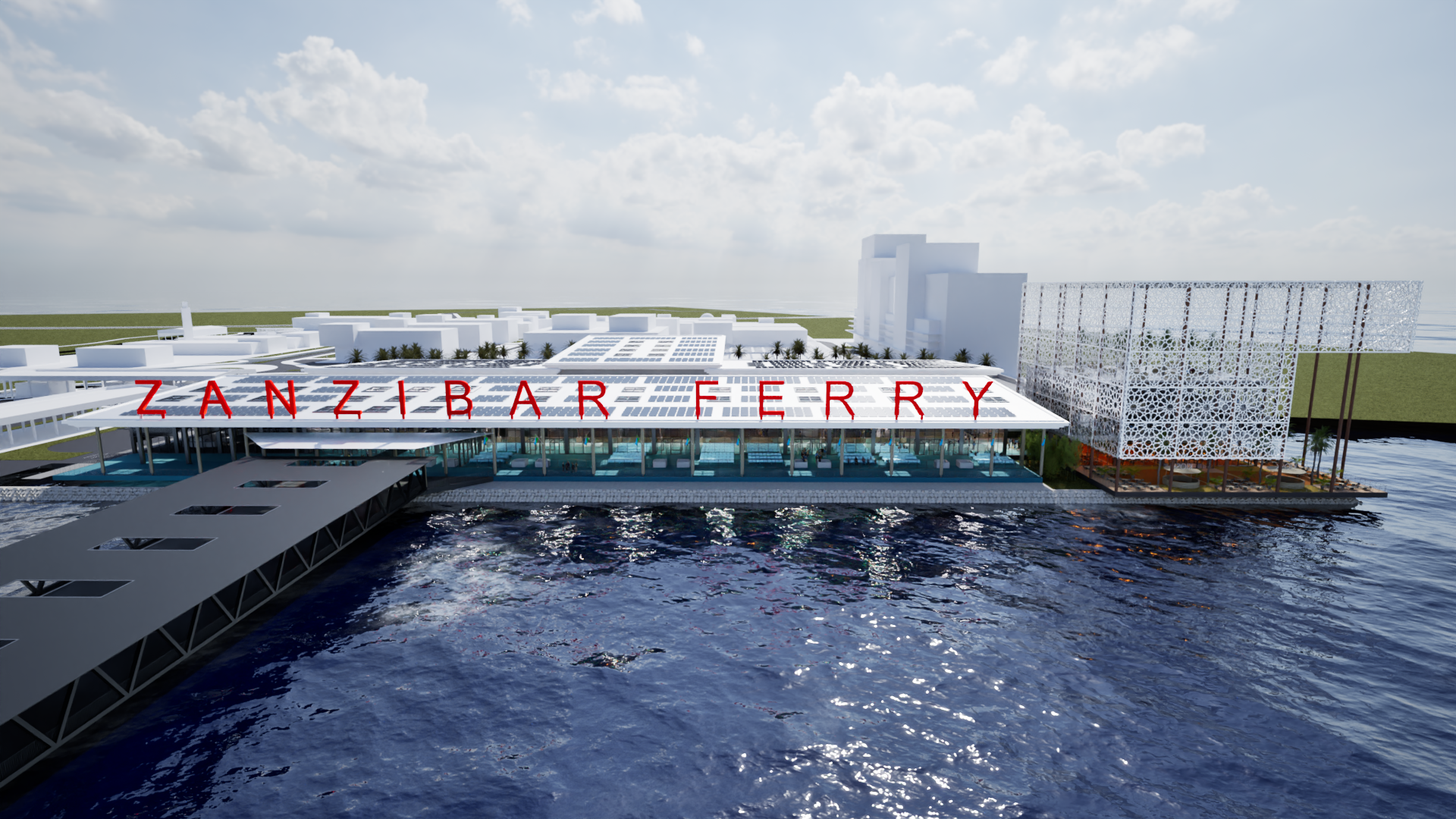render a vibrant modern ferry terminal with a sleek architectural design featuring a white facade with intricate patterns the roof displays bold red letters spelling zanzibar ferry surround the terminal with deep blue and shimmering teal waters reflecting the structure capture a partly cloudy sky with soft white clouds adding depth to the scene include lush greenery and palm trees for a tropical atmosphere highlighting a lively welcoming ambiance