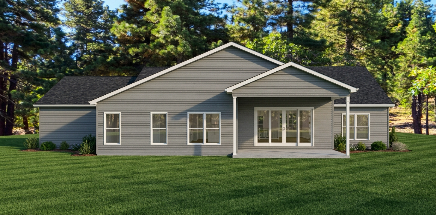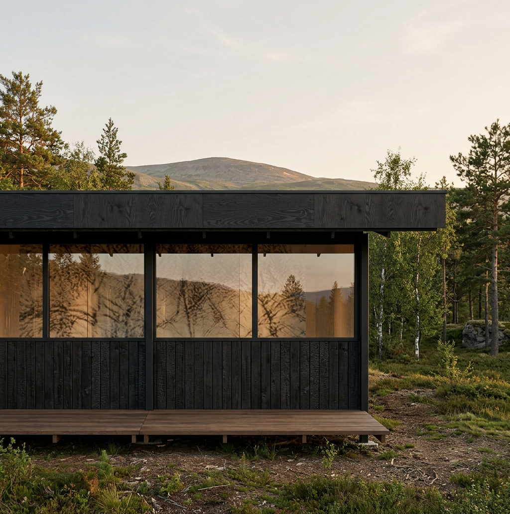 important do not change the geometry proportions or camera position only enhance materials lighting reflections and landscape goal create a high quality exterior architectural rendering that looks like a professional architectural photograph the image should emphasize realistic reflections on the glass accurate material textures and a harmonious natural environment with a scandinavian architectural aesthetic exterior materials structural frame exposed pillars and beams in matte black steel exterior walls black charred wood cladding japanese shou sugi ban style installed vertically window frames black pvc minimal profile exterior deck flooring wide wood planks similar to oak dark wood tone but not black landscape natural setting with a mountain in the background gentle slope not steep trees surrounding the house integrated naturally with the landscape simple natural terrain and vegetation lighting soft late afternoon light with warm tones subtle warm interior artificial lighting visible through the windows realistic glass reflections and soft shadows rendering style photorealistic architectural photography scandinavian minimalism reference balanced composition and calm atmosphere high realism in materials and reflections
