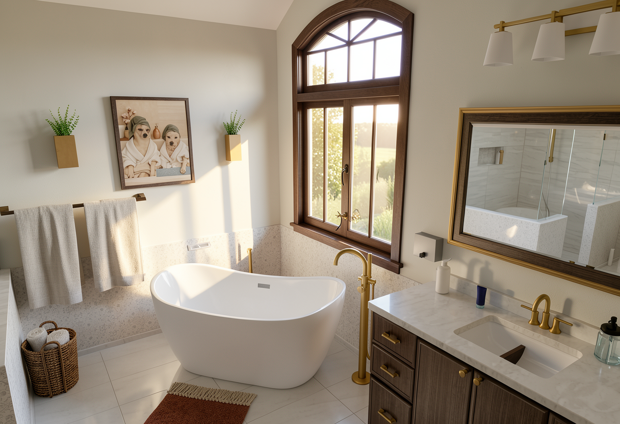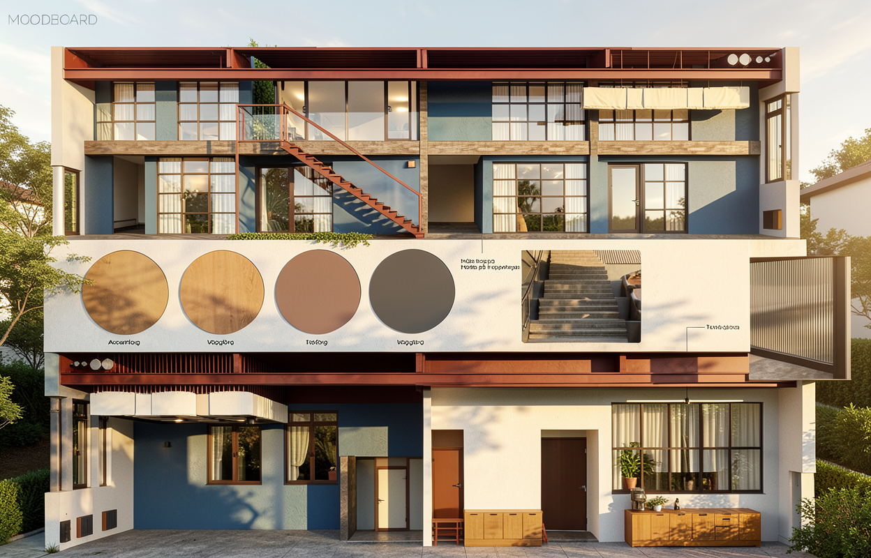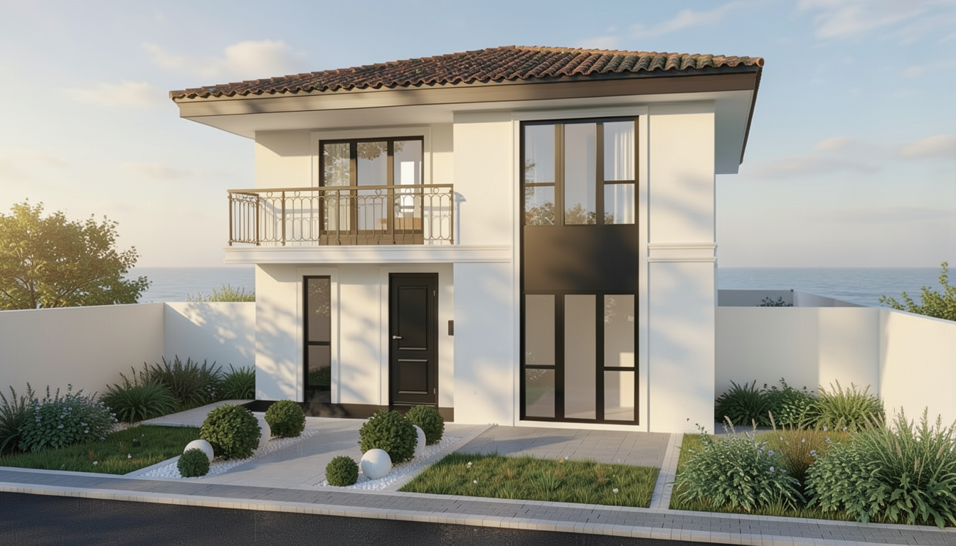 strictly preserve the original image and geometry exact same camera angle and framing no changes to architecture and any elements no modification to walls doors or openings keep all furniture exactly as is do not add or remove any objects no redesign no deformation preserve all original materials and colors no reinterpretation no new elements enhance only lighting and realism soft architectural photography style warm late afternoon ambient light soft diffuse shadows calm and balanced atmosphere subtle artificial ambient lighting only from the existing rattan pendant and ceramic suspensions lights warm soft glow realistic light diffusion no new light fixtures natural materials with subtle imperfections except the kitchen bar which is perfectly new and uni matt slightly aged wood with light patina realistic rattan texture with fine weaving detail natural irregularities and softness gentle texture variation no overly perfect surfaces rural outdoor background with fields inspired by the alsatian sundgau landscape with a modern barm type metal siding soft natural horizon coherent with interior lighting visible only through existing openings no new windows or exterior views keep all the existing ceiling and the joineries in the same color of sketchup 50mm lens shallow depth of field slight film grain soft contrast natural color grading