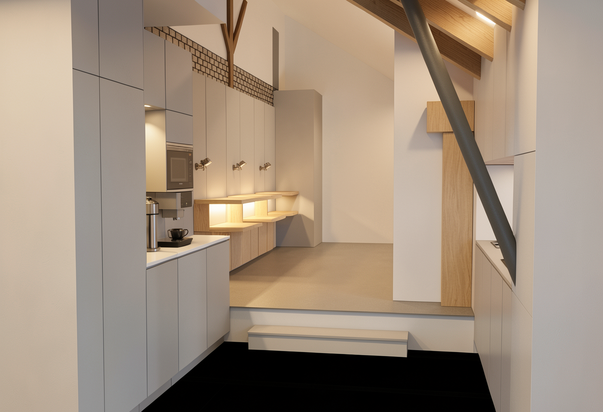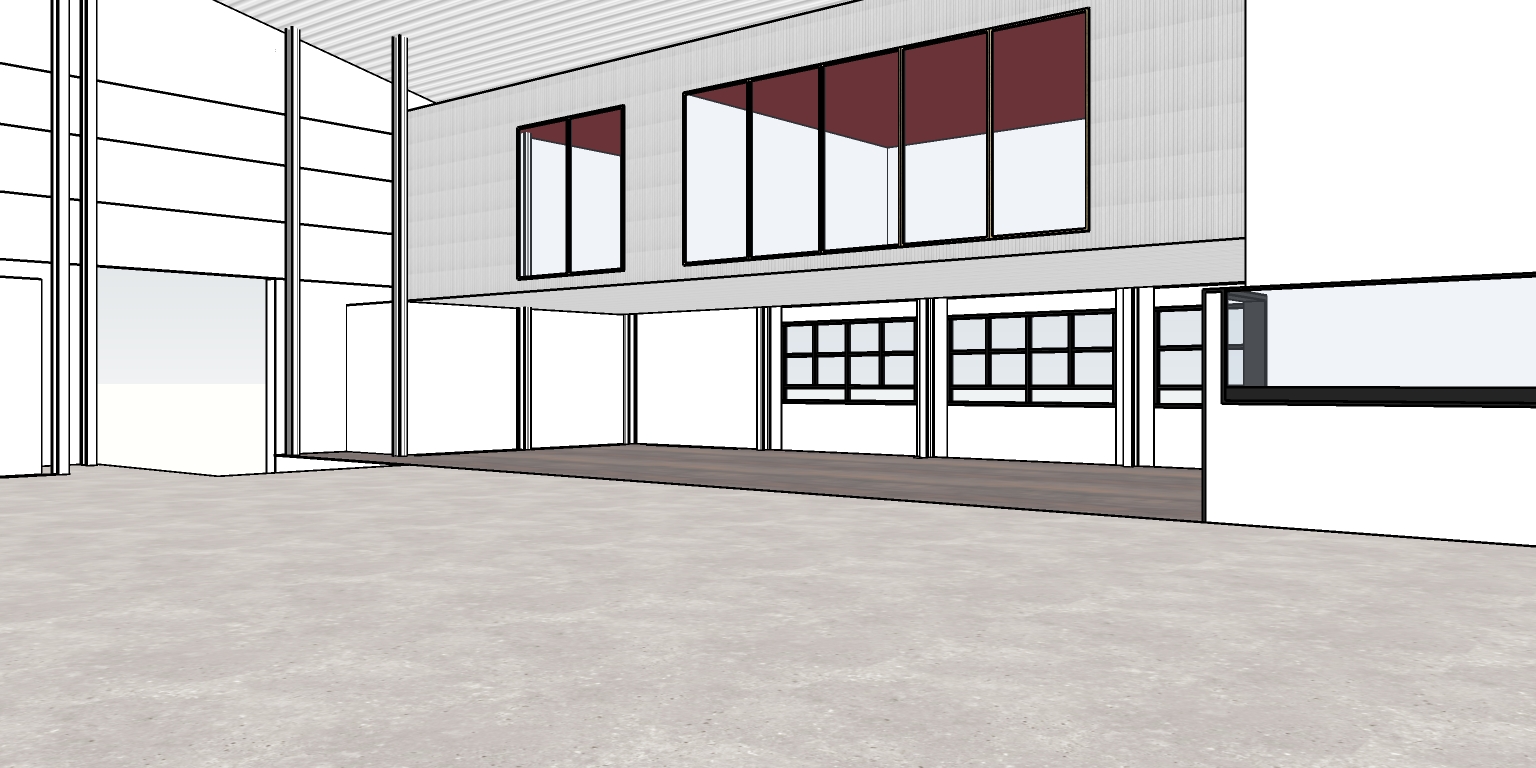 create photorealistic render with natural afternoon lighting add horizontal tube lighting add roller shutter to left opening feature carpet under mezzanine warehouse walls white mezzanine walls cladded