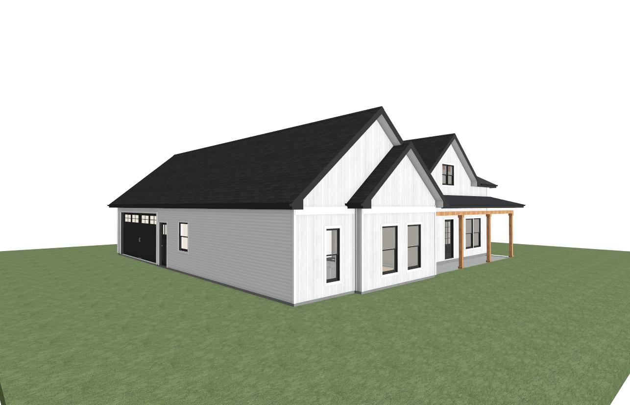 a modern farmhouse with white vertical siding in front white horizontal siding on all other sides black shingle roof black standing seam metal roof on front porch and natural timber posts supporting the covered patio retain the exact structure window arrangement patio columns balcony rooflines foundation height and proportions exactly as shown in the reference image add a smooth concrete front sidewalk extending toward the house integrated naturally into the sloped terrain surround the property with a farm field in the background with a groups of trees surrounding it create ultra realistic lighting crisp shadows detailed textures in the siding and glass reflections and a vibrant clear sky with light atmospheric depth render in hyper realistic architectural visualization quality 8k resolution add a car near the garage with farm machinery in the fields behind the house