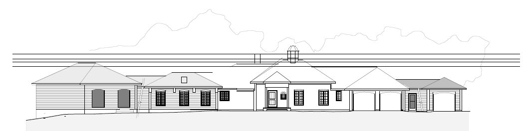 generate beautiful elevation renders french chateau looking photograph of a grand off white sided home with brass trims situated on a grassy hill at sunrise the home features multiple windows and a pitched roof with chimneys two large leafy trees frame the scene with sunlight filtering through their branches casting long shadows a misty atmosphere rises from the grass creating a serene ethereal effect the foreground shows gently rolling grassy hills while the background includes a clear blue sky with a warm golden glow from the rising sun lush gardens in front of the home with pebbled driveway in front of the garages maintain locations of windows and roof lines ignore the long horizontal lines at the top and the cut lines where the home angles in farrow and ball pigeon paint for window and door trims natural french oak wood for doors dark grey shingled roof bronze lighting accessories farrow and ball skimming stone painted siding