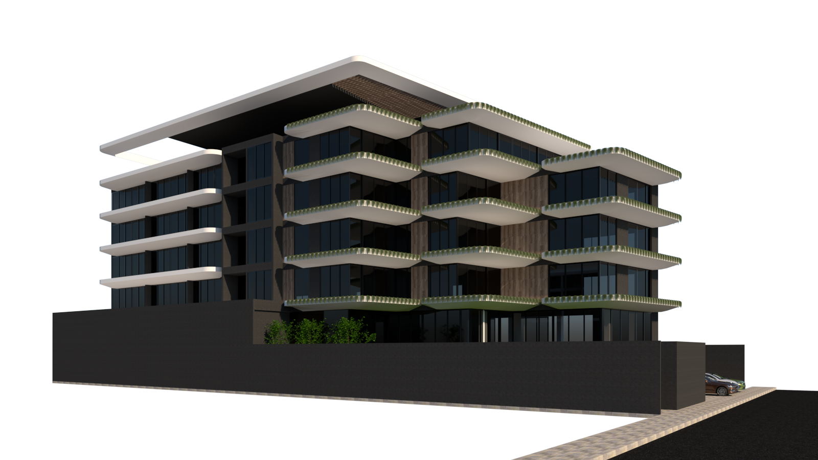 a modern multi story building with a sleek design the building features a dark gray exterior with large reflective glass windows and white horizontal balconies the rooftop is flat with a subtle light wooden accent vibrant green plants line the edges of the balconies adding a touch of nature the scene is set in a clear sunny sky with a light blue hue creating a bright and welcoming atmosphere the ground is a dark asphalt with a light gray textured sidewalk surrounding the building a luxury car is parked near the entrance enhancing the sophisticated setting