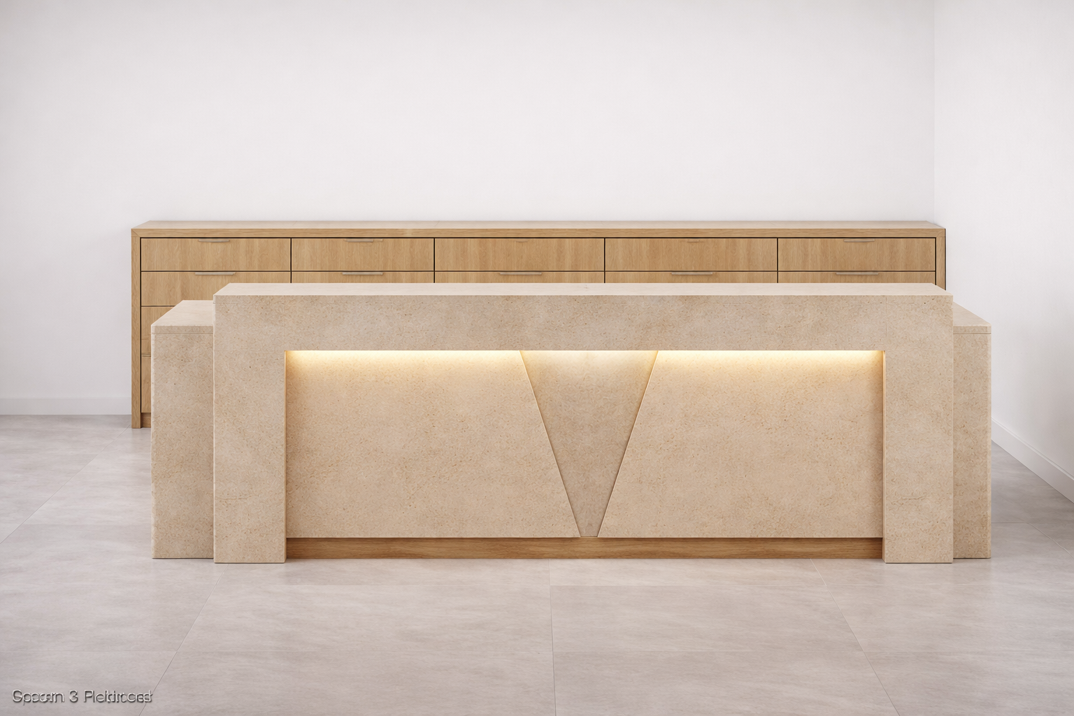 change the back wall to only 4 cabinets long make the front of the reception area taller and the front flat