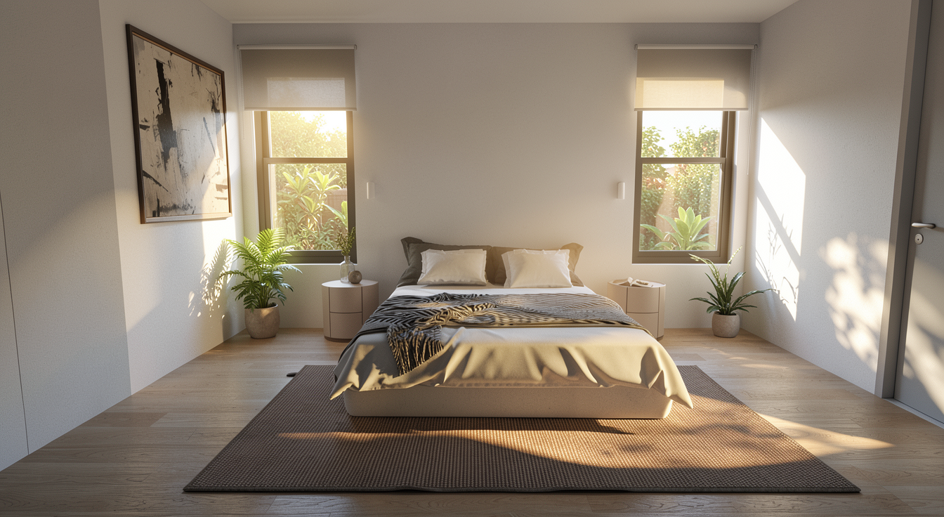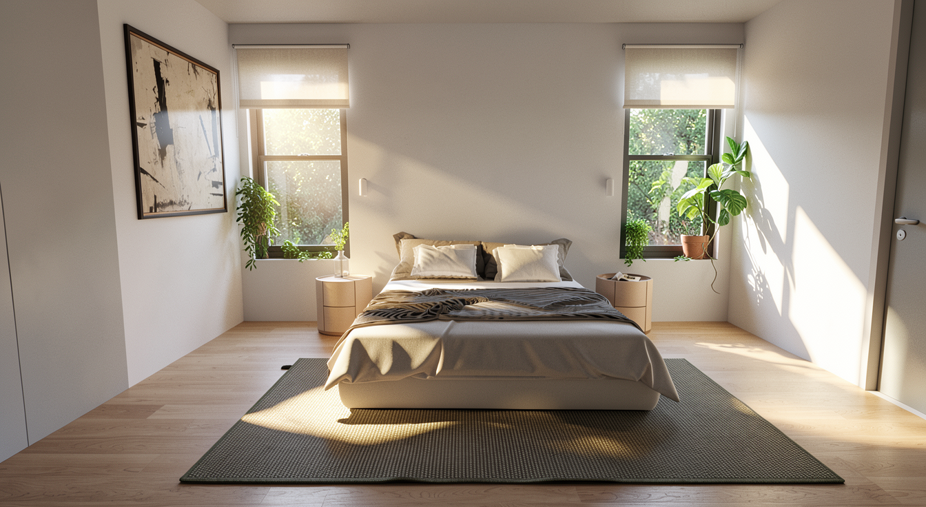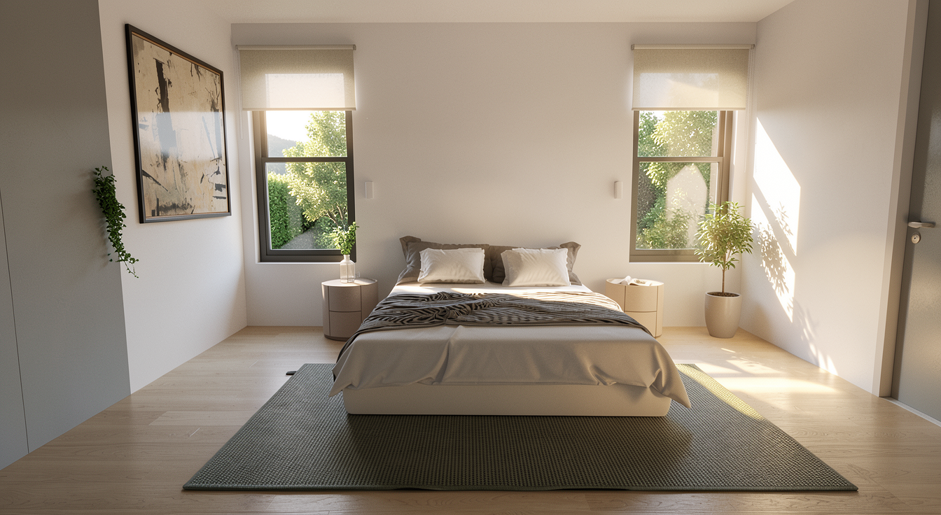 create a realistic high quality interior render with abundant natural daylight the scene should be illuminated by bright warm sunlight entering through windows the lighting should feel soft yet vibrant creating natural shadows and a fresh daytime atmosphere outside the windows include a lush green view with trees and foliage suggesting a sunny day in spring or summer the greenery should appear vivid and slightly sunlit enhancing the connection between the interior and nature the overall mood should feel airy calm and inviting with clear daylight tones and realistic light reflections on surfaces avoid artificial lighting dominance natural sunlight should be the primary light source there are built in wardrobes opposite do not change the colors or the shapes improve the lighting slightly